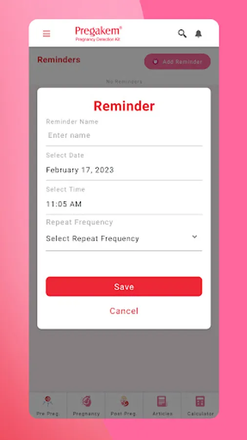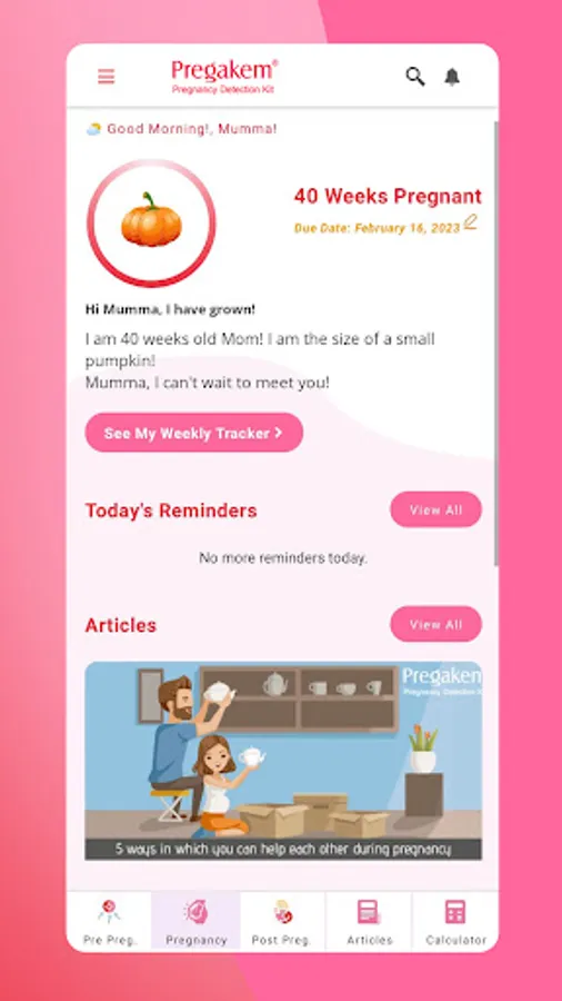 Post Pregnancy – The Post-Pregnancy tab is where you will find reminders, baby food recipes, parenting tips, articles and FAQ. To start with this tab, you need to fill in your name and date of birth. After filling in your details, another screen will appear where you need to fill details about your baby which includes the baby’s name, date of birth, and gender.