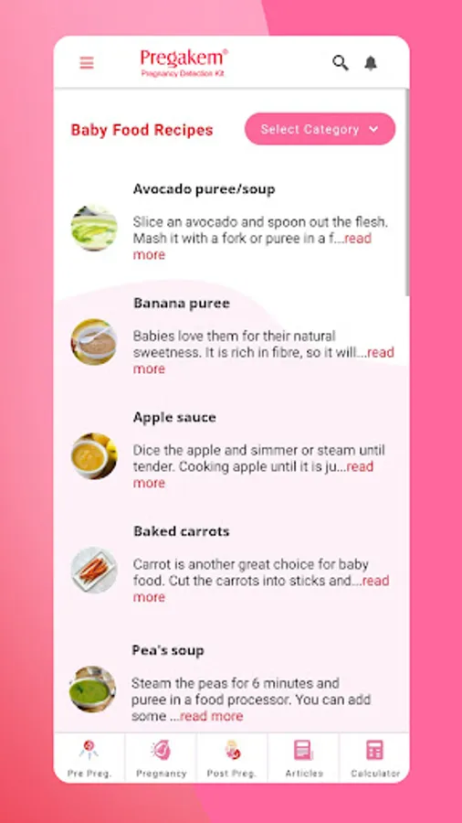 Baby Recipes – Confused about what to feed your baby? Don't worry! Our app has a collection of baby friendly recipes. You will find this section in the Post-Pregnancy tab. The recipes are categorized according to your baby’s age. The categories range from 4 months to 6 months, 6 months to 8 months, 8 months to 12 months. The recipes will be shown accordingly.