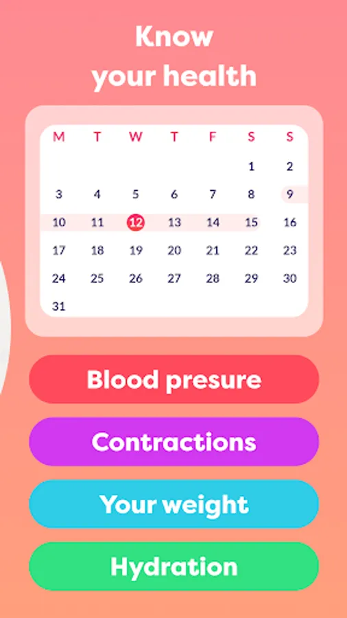 Thanks to our pregnancy tracker, you will be able to track your health: log your weight, blood pressure and heart rate during these 280 days. Plus, our contraction timer will help you in the last stage to know when you're going into labor.
