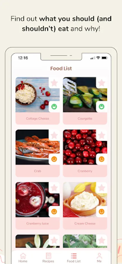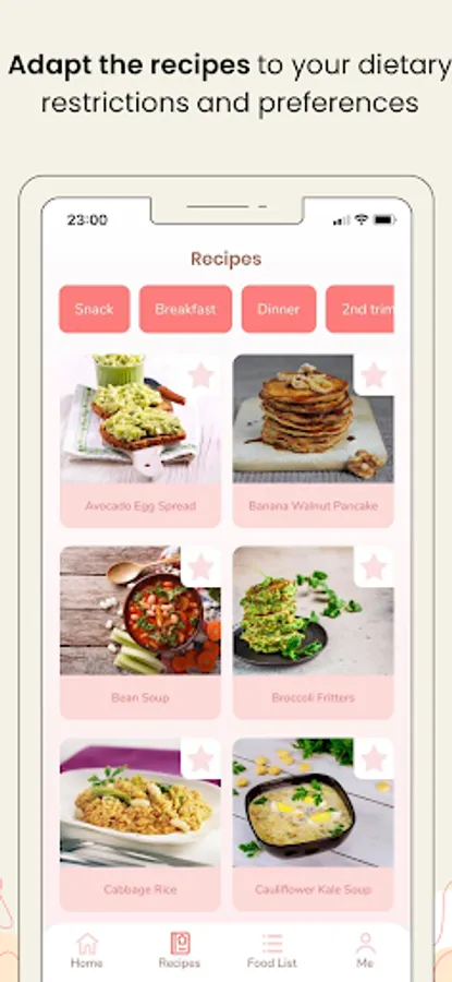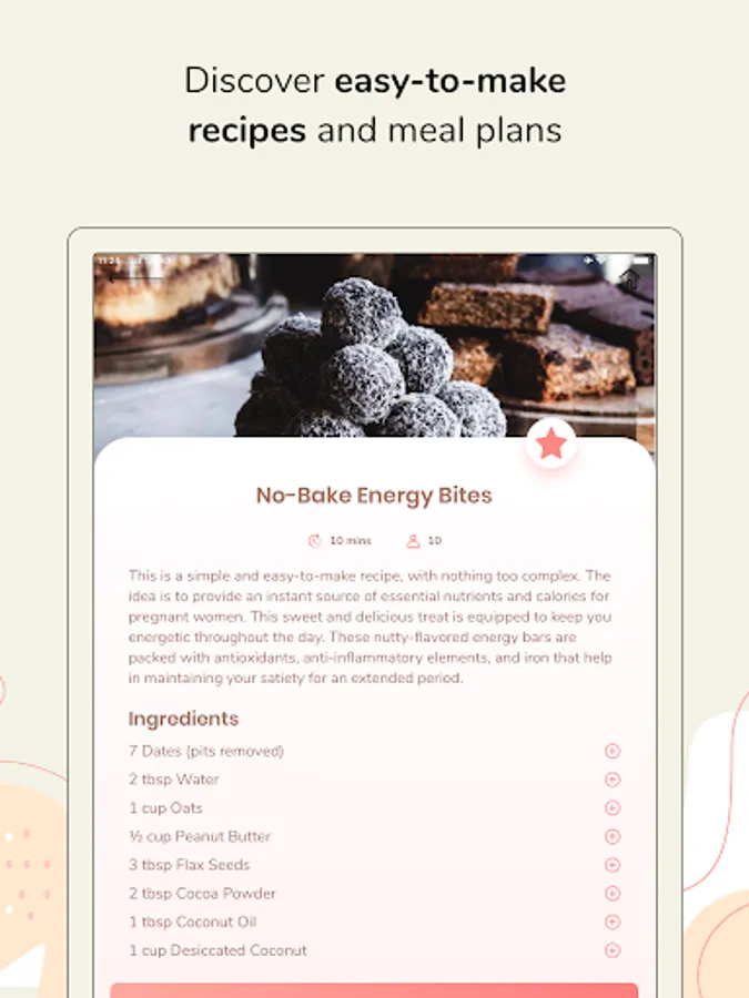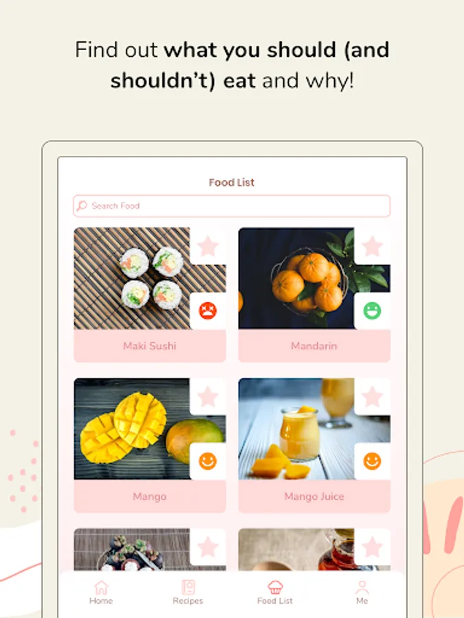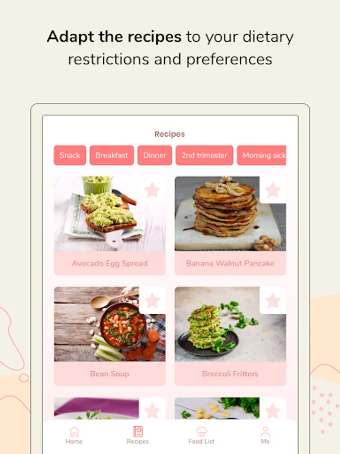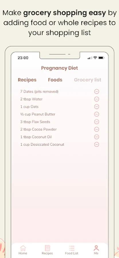 Save healthy recipes for your pregnancy and easily prepare your groceries thanks to our grocery list feature.