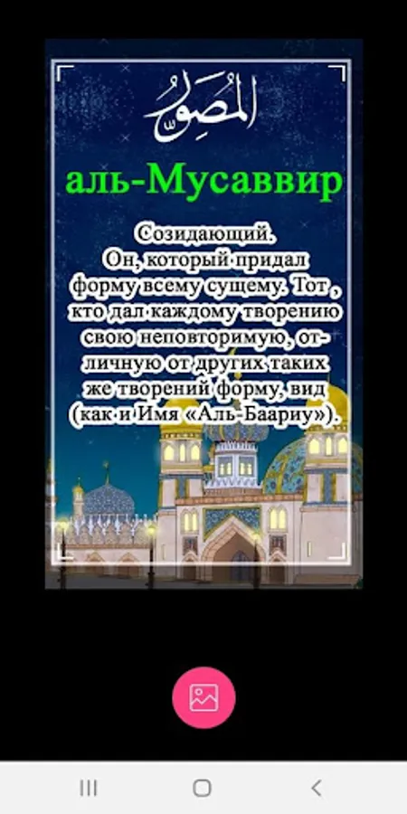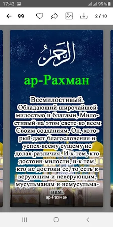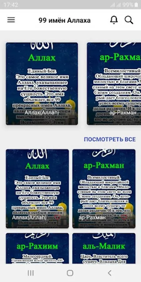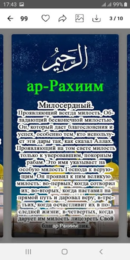 The number of names of Allah is not limited to 99, because the Almighty has innumerable perfect attributes and Beautiful names, the essence of which only He Himself knows. But from the hadith the following 99 names are known which are shown in this application.