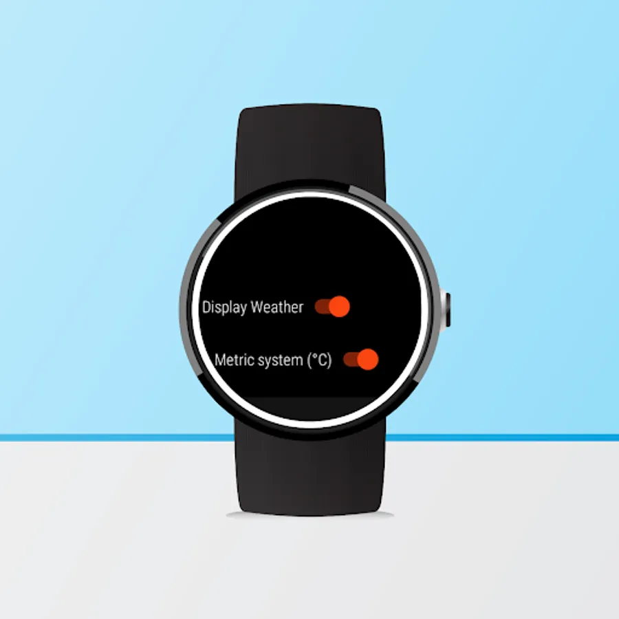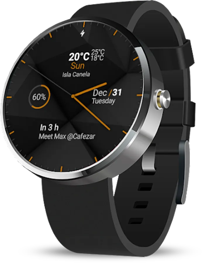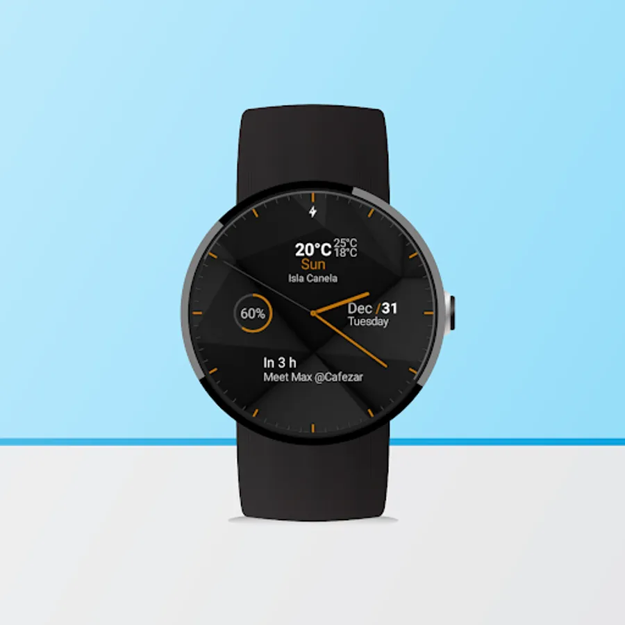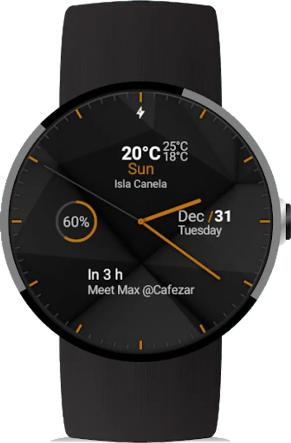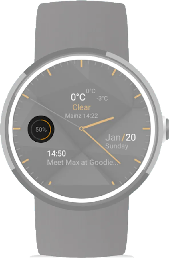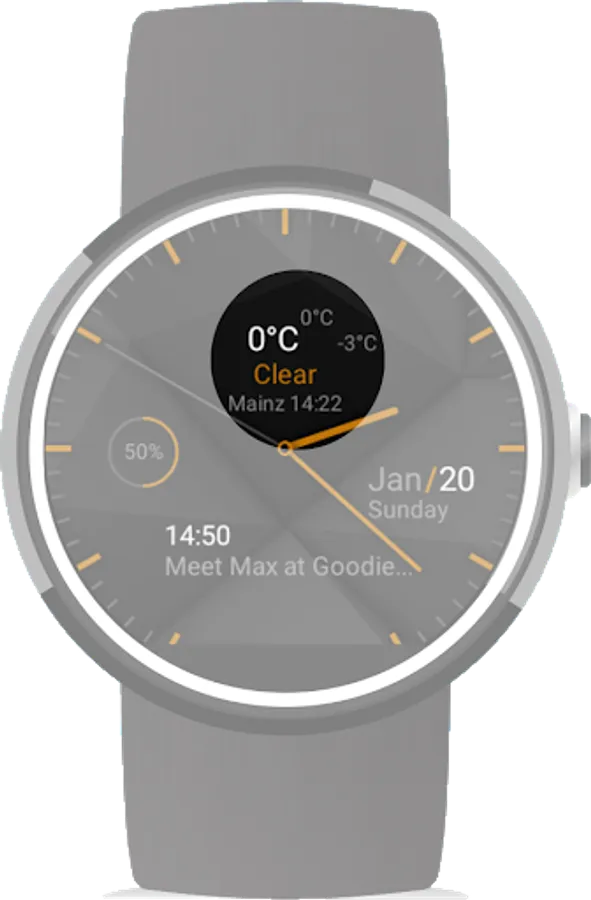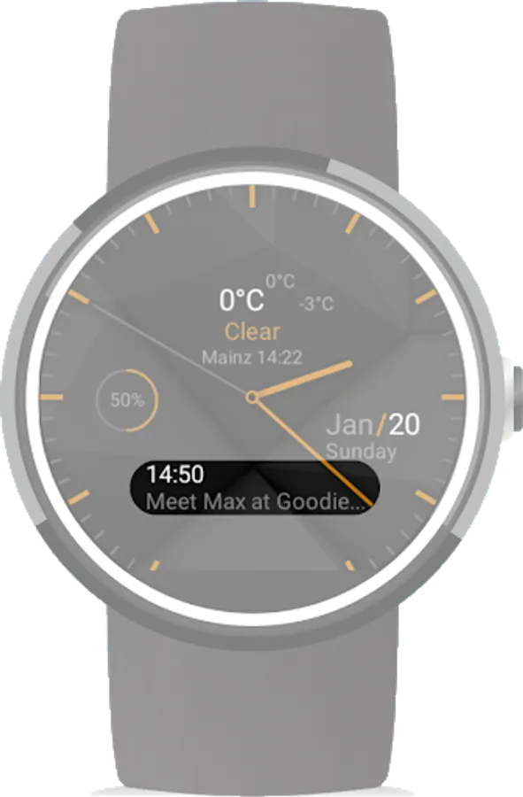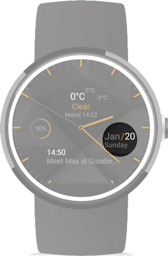A minimalist classic design Android watch face, with date, battery indicator, calendar event and weather forecast.