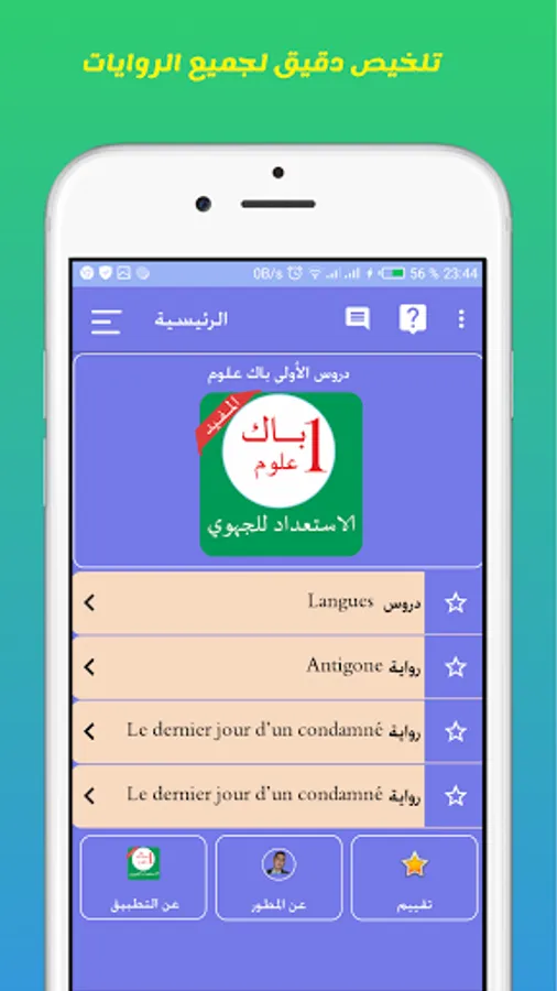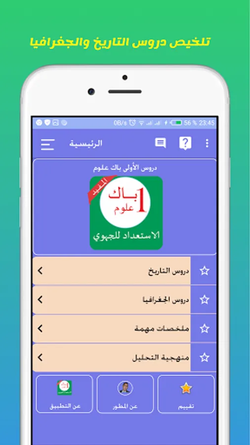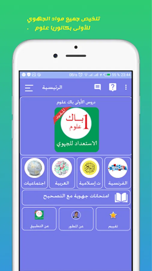We offer you the 1Back Science application for review and good preparation without getting bored in a very easy and useful way. This application contains all the lessons in all the subjects of the regional exam for the first Baccalaureate of Science. The application will help you understand the lessons well.