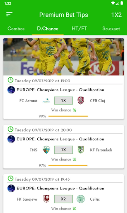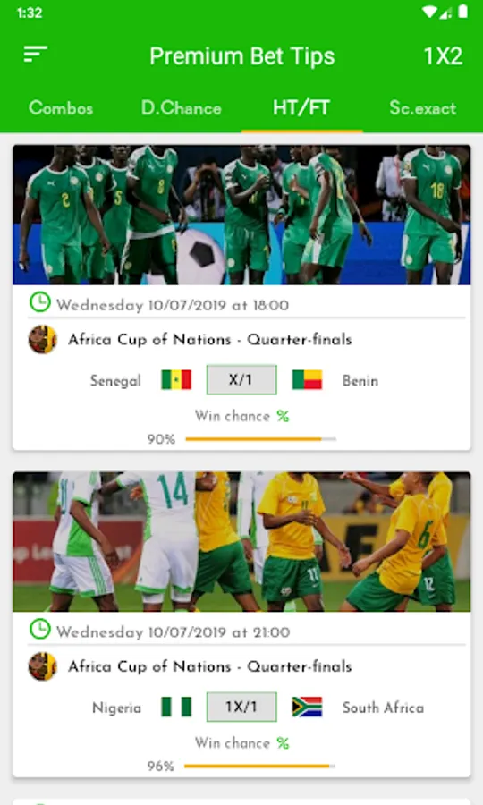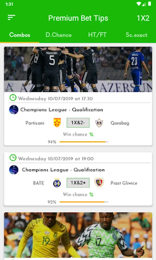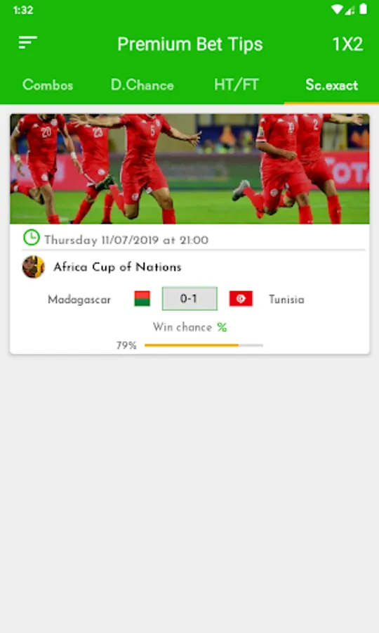✔ Our tips are classified according to 4 types of bets: combined, double chance, 1st / 2nd half, exact score.