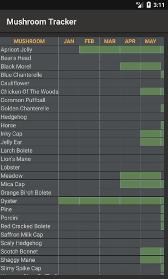 A calendar of all the edible mushrooms in the list. Know when is the best time of the year to go harvest