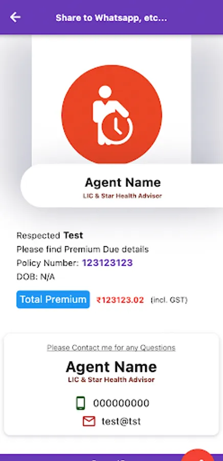 Social Sharing: Share your insurance premium due details with your contacts via WhatsApp, Facebook, Twitter, and other social media platforms. Keep your loved ones informed and promote financial responsibility.