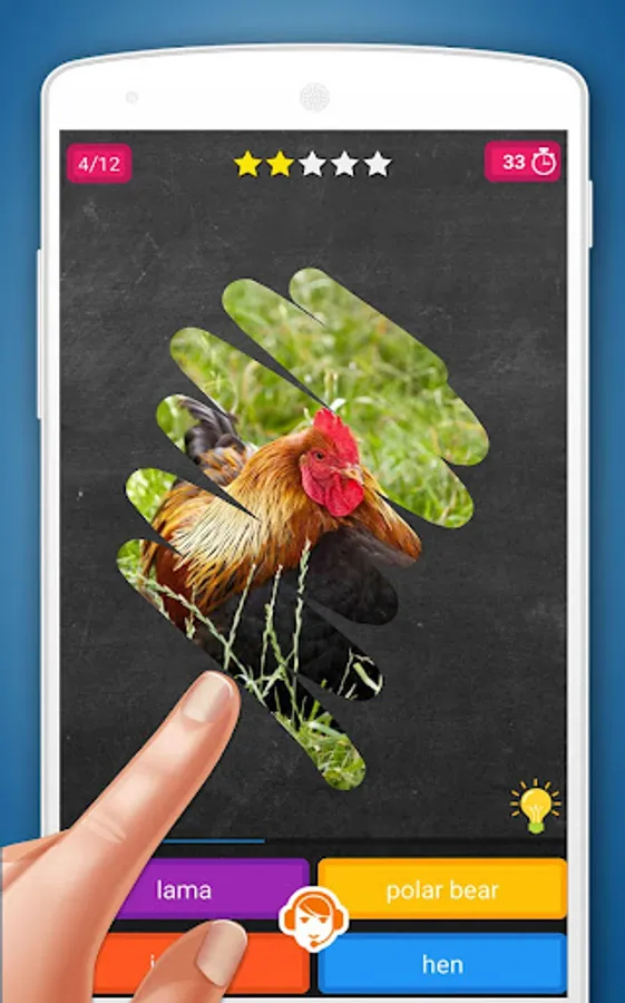 The level of difficulty increases with each step, but do not worry, as you earn enough points you can use prompts. There are two types of prompts: recreating the sound of an animal or hide two incorrect answers. But be sure, to use the prompts is costly and reduces the number of gained points.