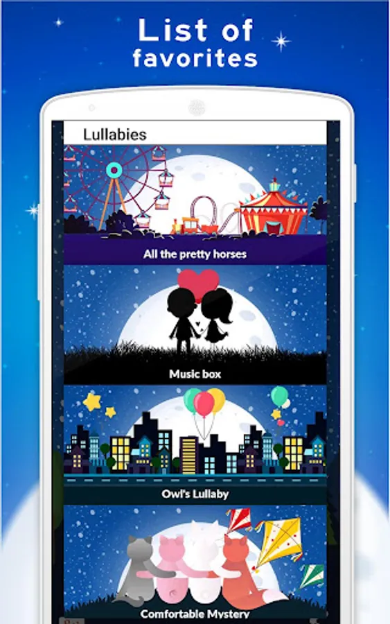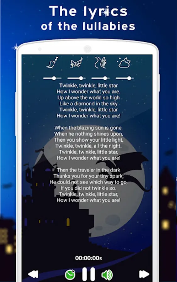 You can choose from a many lullabies such as Twinkle Twinkle Little Star or All the pretty horses, which have been helping children and parents all over the world for years and will instantly lead you and your child to the land of bliss and fabulous dreams.