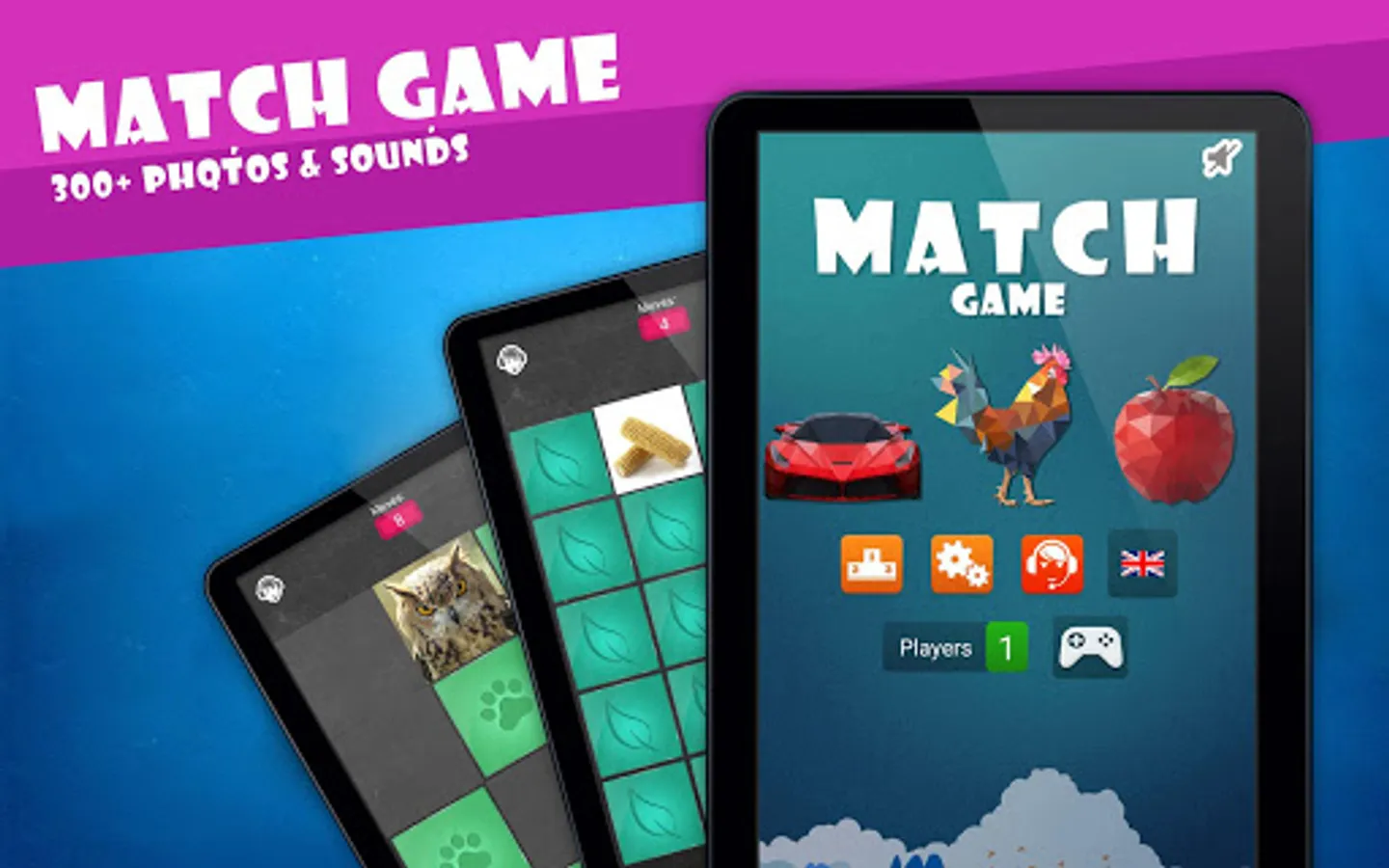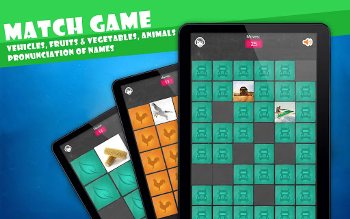 Exercise your memory with the match game, guess the animals, cars, vehicles, vegetables and fruits. If you like puzzles or other quizzes the match game is for you.