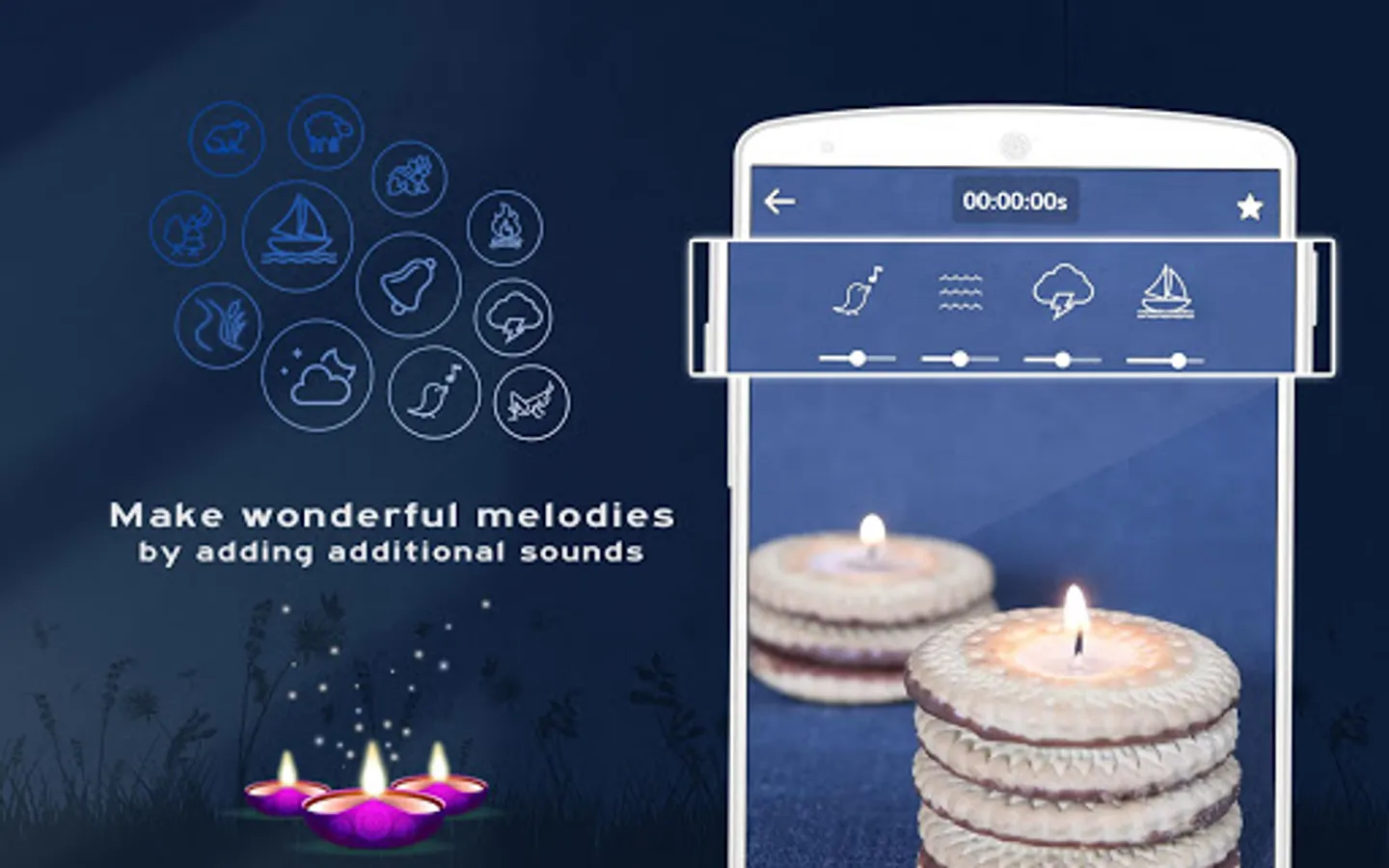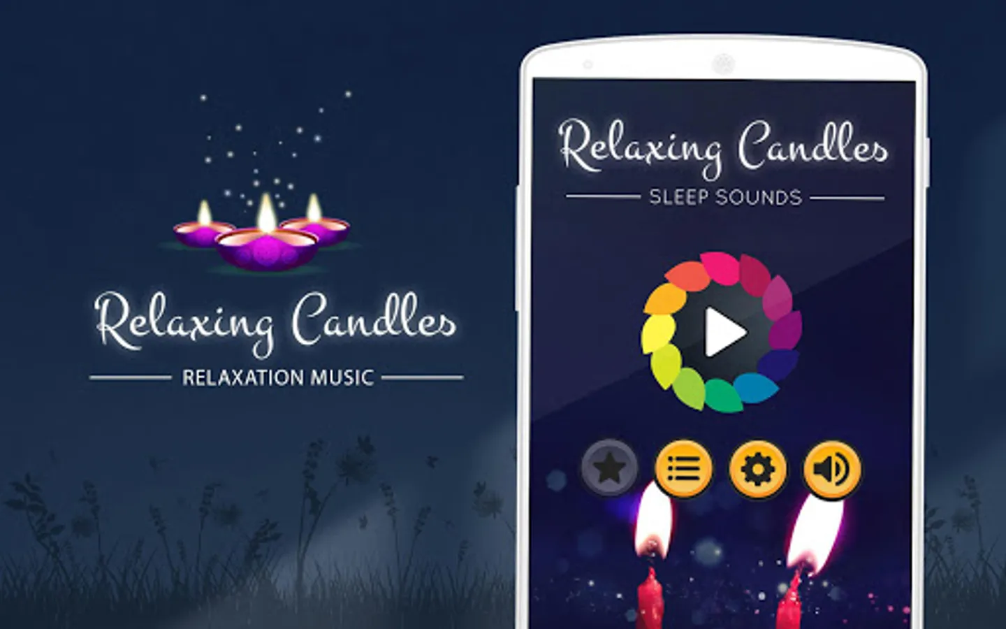 Download the application and free yourself from stress. Look at the soothing flames of candles, listen to relaxing music and melodious sounds, relax your mind and soul. A large collection of calming sounds and melodies as well as a view of the soothing flames of candles will help you mute and calm down yourself.