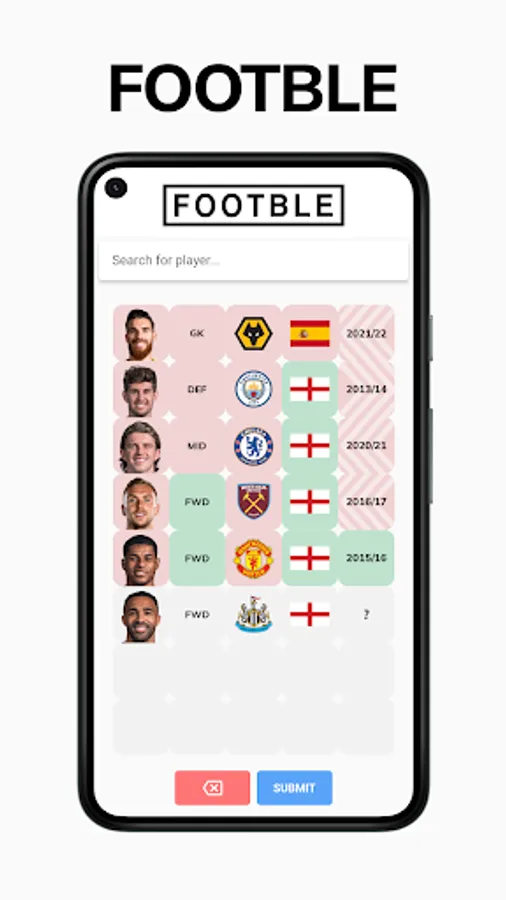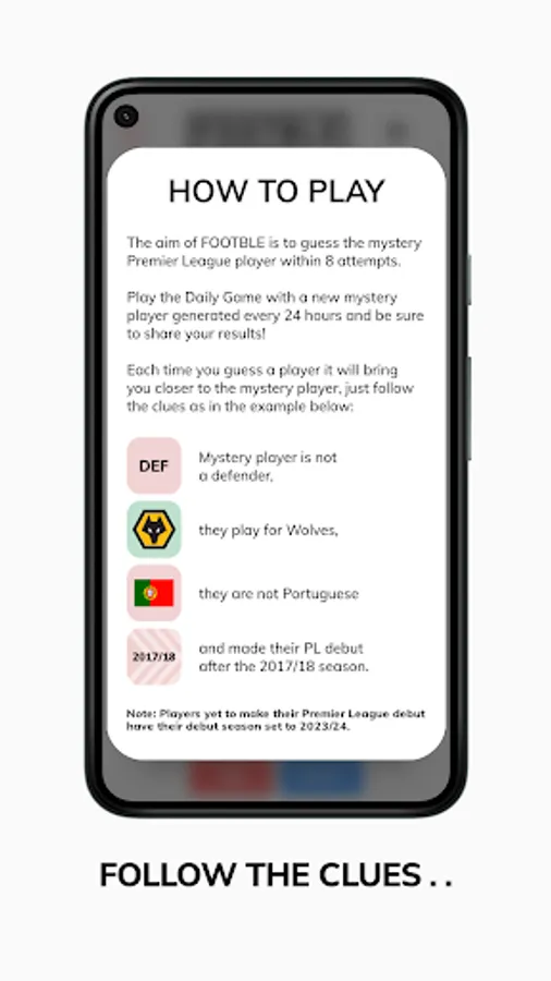 Footble is a daily puzzle in which everyone tries to reveal the Mystery Player of the day! By guessing current players, you must follow the clues to bring you closer to the big reveal. You have eight attempts to see if you can unmask the Mystery Player. But be warned! If you fail to guess the Mystery Player in your eight attempts you may never know his true identity! Be sure to share your results with friends, family and online to see who can find the Mystery Player in the fewest number of guesses.