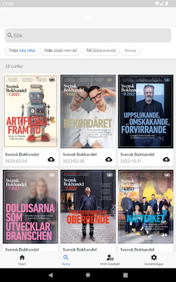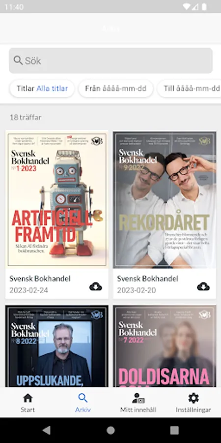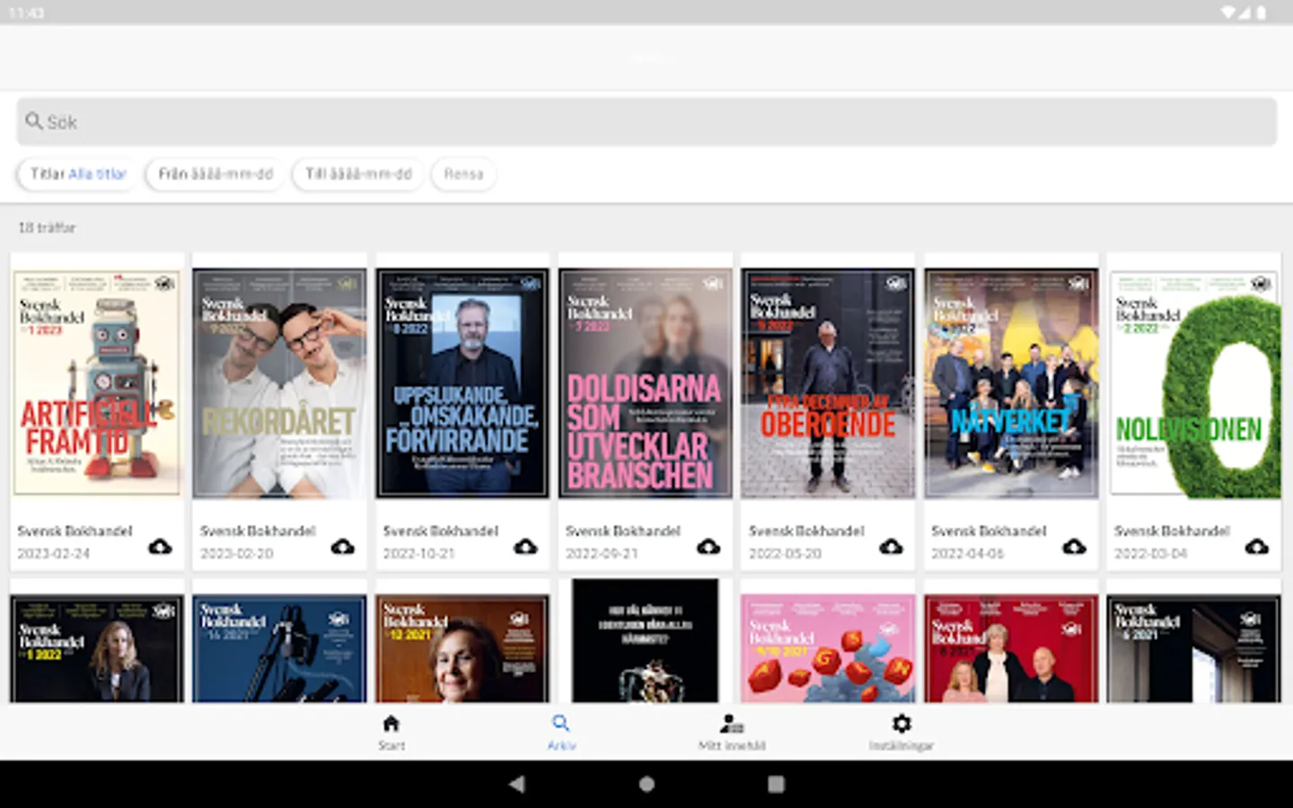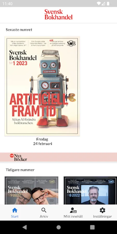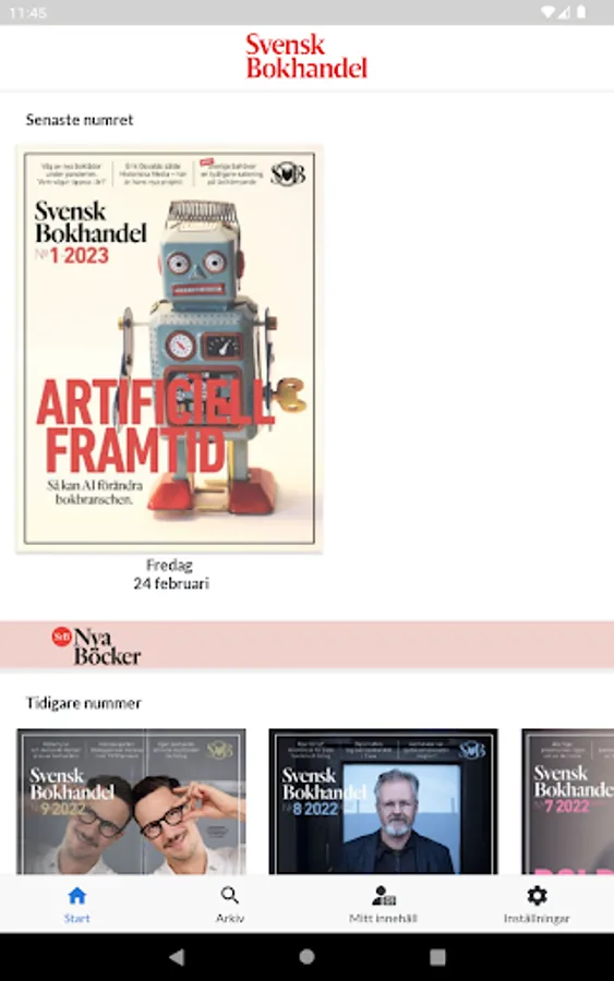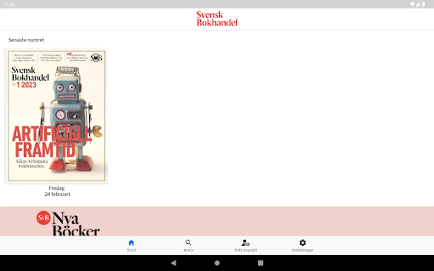 In this app you browse and read the digital version of Svensk Bokhandel's paper magazine. Here you will find reportage, analysis and in-depth information about the Swedish book industry. In addition, you can take part in the most complete catalogs of book publishing in Sweden: Vårens-, Sommarens- och Höstens Böcker.