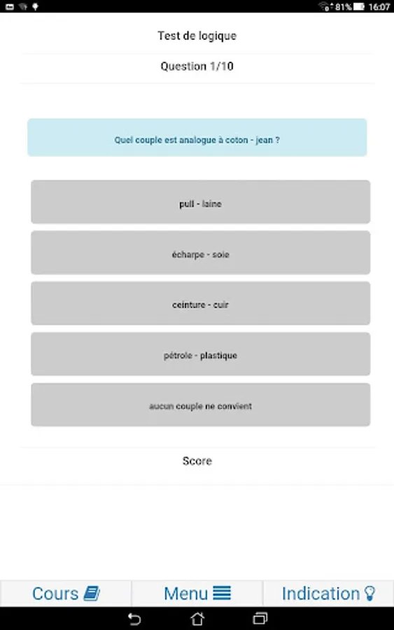 For the military competition, get ready for the dreaded aptitude test. Prepa IFSI contains clear lessons, great tips and many corrected exercises. Prepa IFSI is an application with artificial intelligence. In the Training mode, this application generates the standard questions that come up every year in the military competition in all the categories of the psychotechnical tests: LOGIC test, NUMERICAL test, VERBAL test, ORGANIZATION tests and ATTENTION and OBSERVATION test.