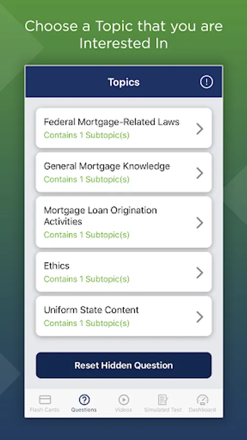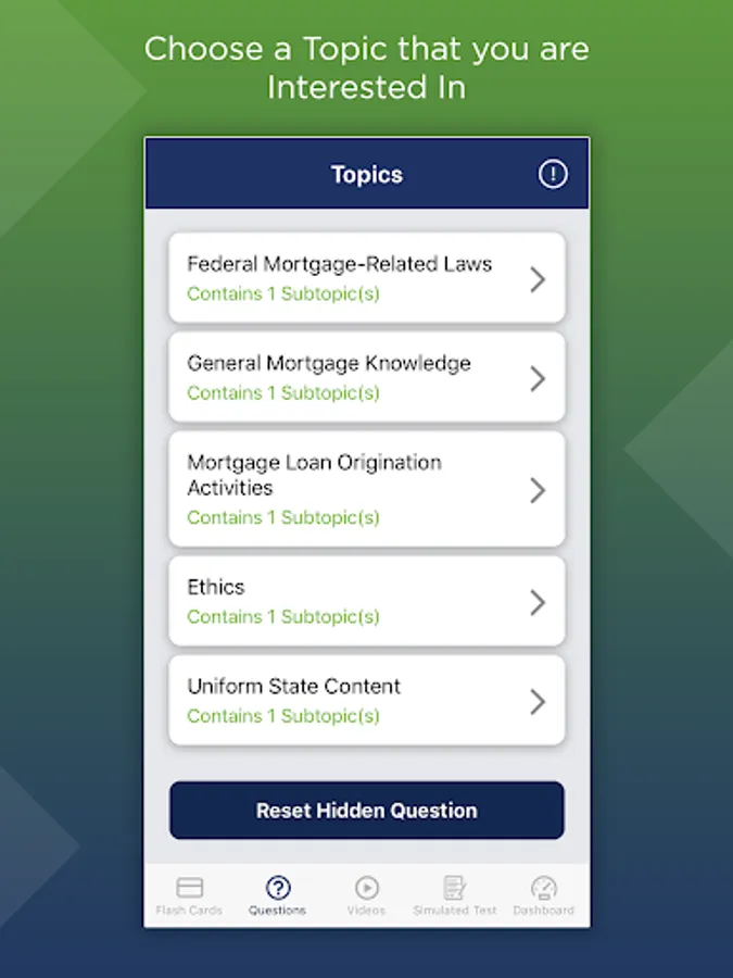 Simulated Exam: Once you’re done preparing using the flashcards and questions, it’s time to test your knowledge! The simulated exam prepares you for the NMLS Test by giving you 190 minutes to complete 125 questions. Once complete, you will instantly receive your score and see how prepared you are!