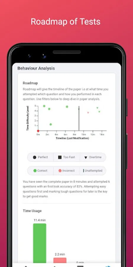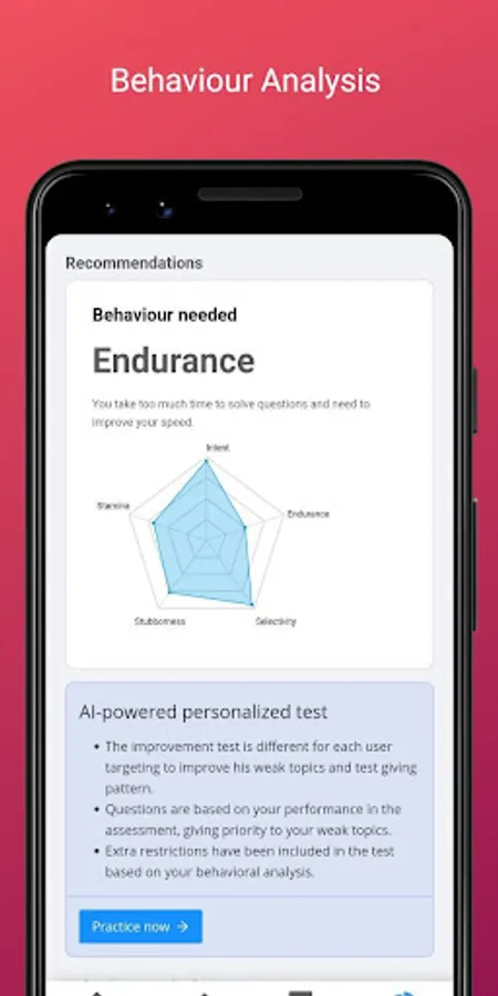 In-depth Analysis: The AI based platform allows the students to track and analyse the tests both quantitatively and qualitatively. It can be done for individual tests as well as the overall performance so far. It also depicts the percentage of the set goals completed and number of days taken to keep a track of the progress that is made.