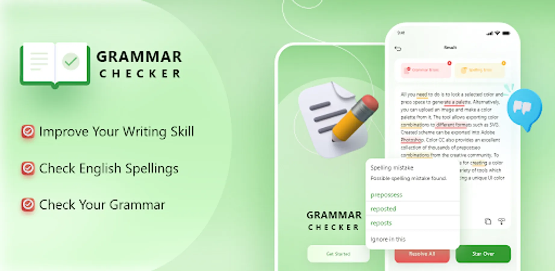 This grammar checker works by analyzing the text and spotting the grammatical errors in it. All the spelling errors are highlighted in yellow and the grammar errors are shown in red. You can either tap and correct the mistake one by one, or you can collectively resolve them using the ‘Resolve All’ button.