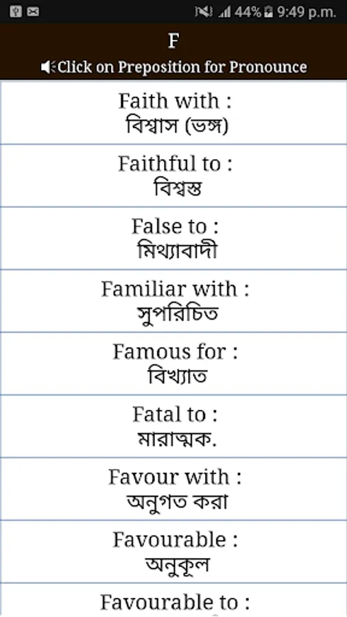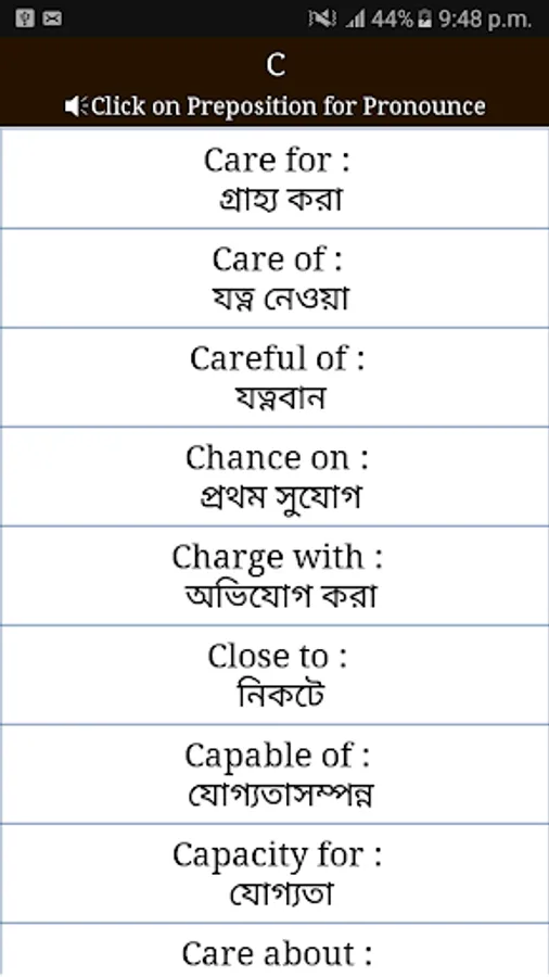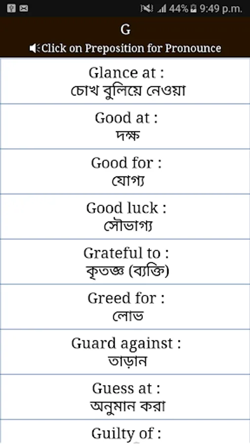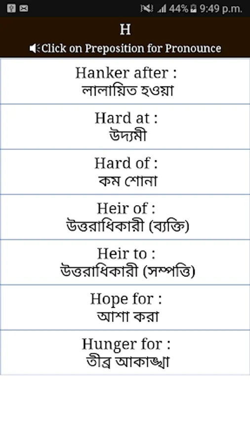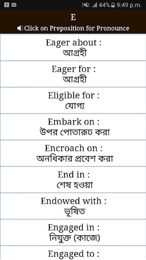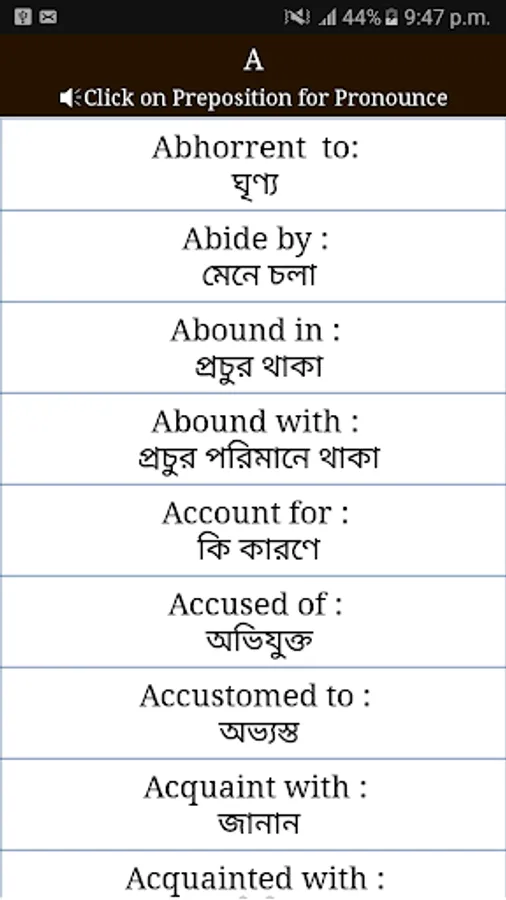 In This App you will get appropriate prepositions with Bangla or Bengali Meaning and English Pronounce