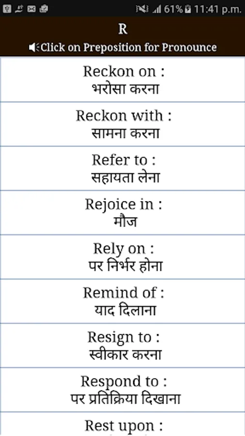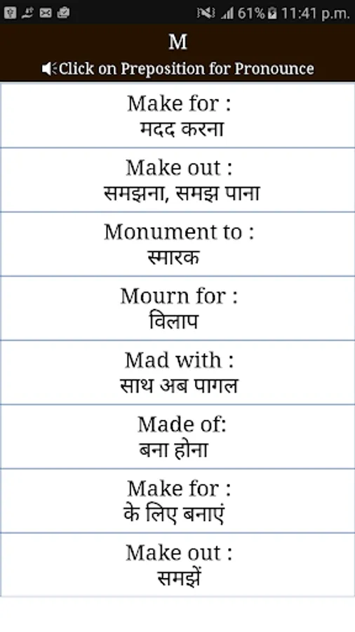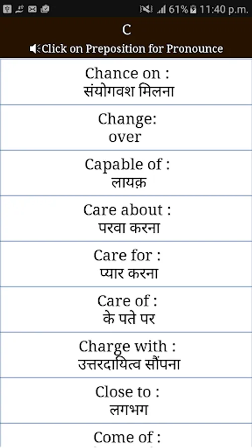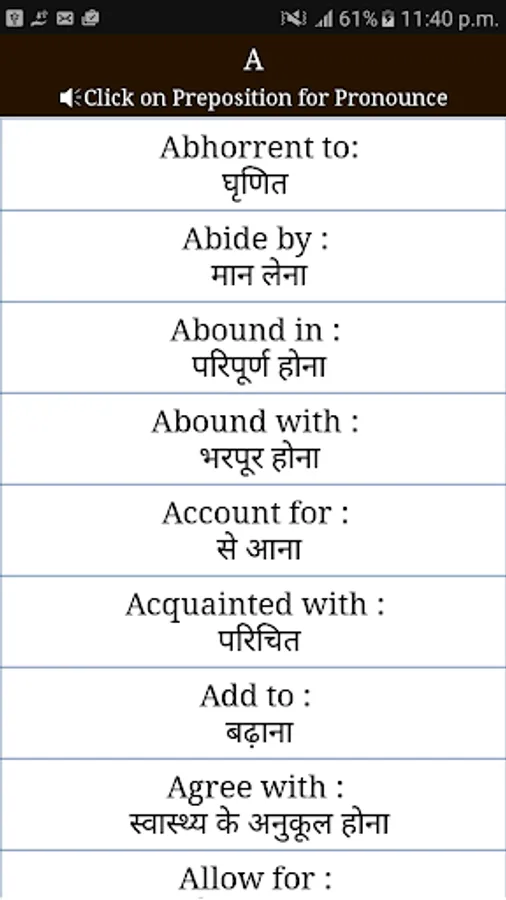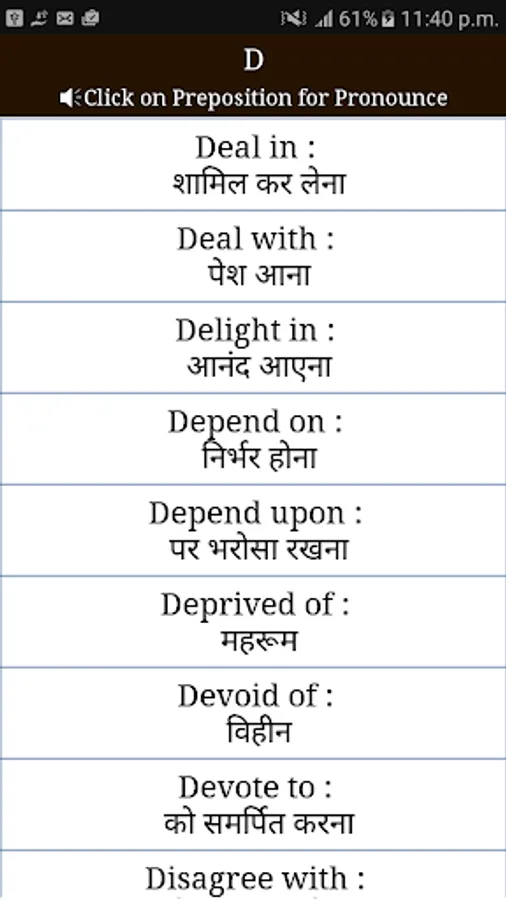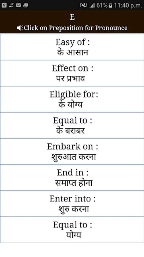 In This App you will get appropriate prepositions with Hindi Meaning and English Pronounce