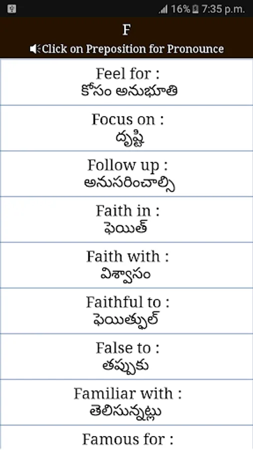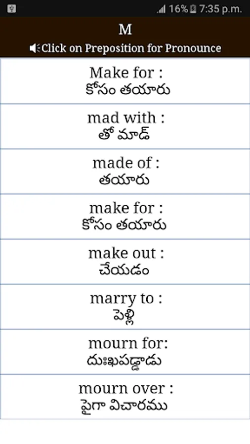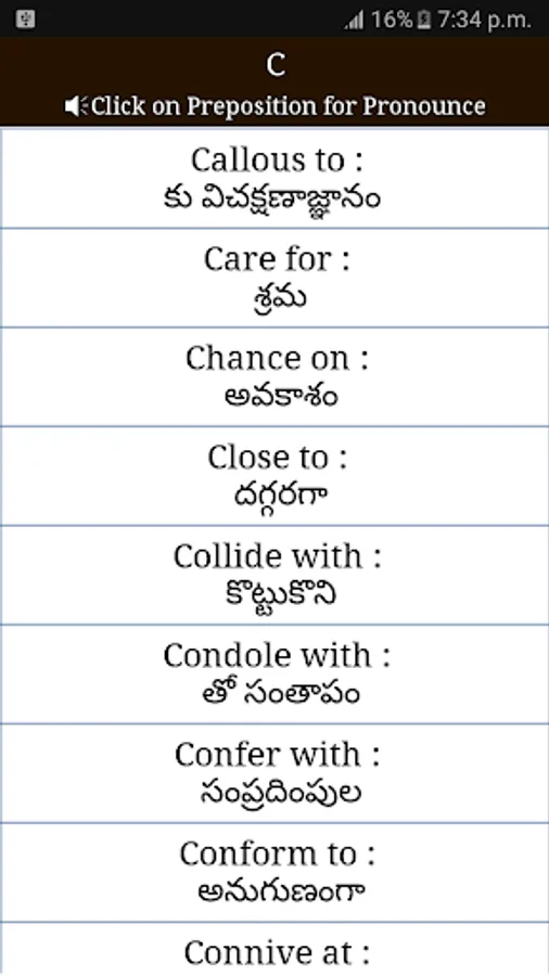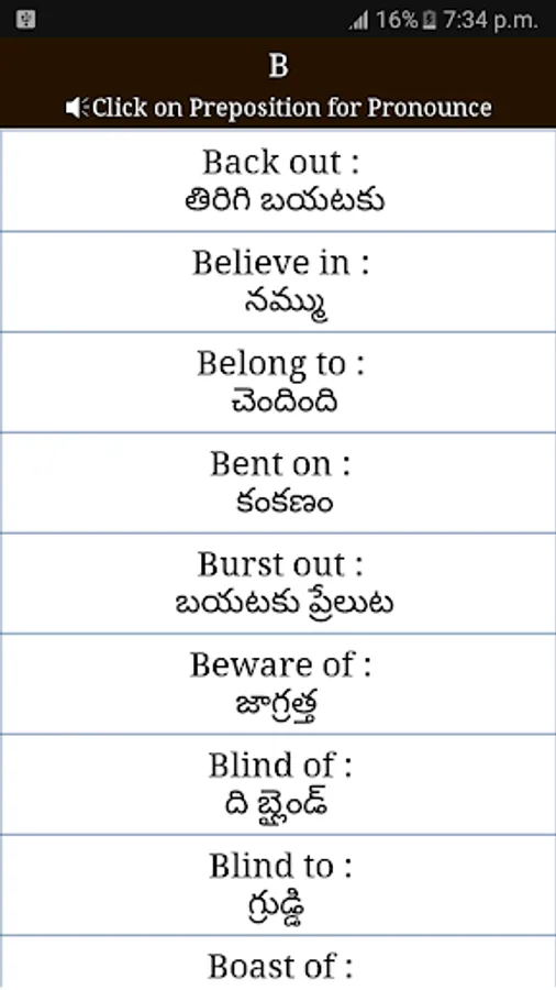 In This App you will get appropriate prepositions with Telugu Meaning and English Pronounce