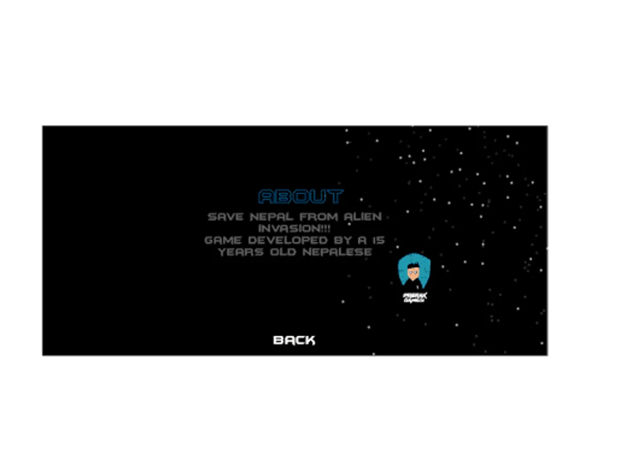 Nepal's Alien Invasion is a 2D action packed space shooter game made by a 15 years old Nepalese game developer "Prerak Giri".The game is based on a plot where you go in a mission to the space and then you get in brawl with the Aliens present there..