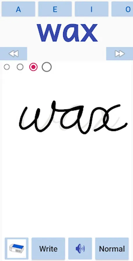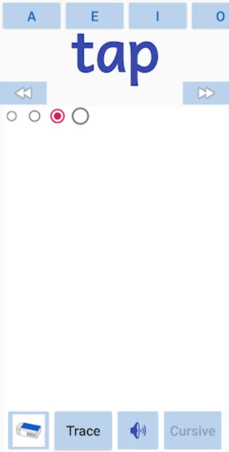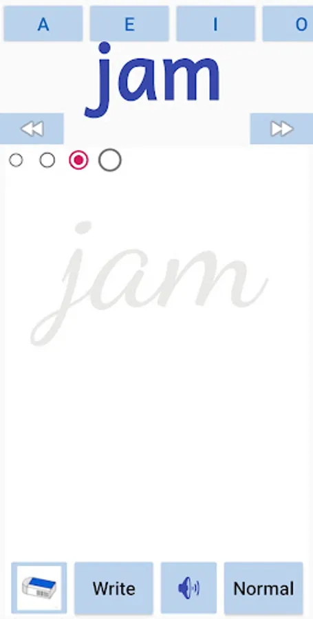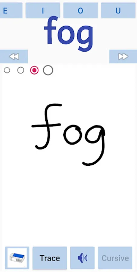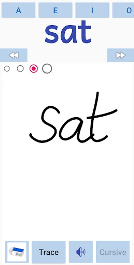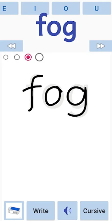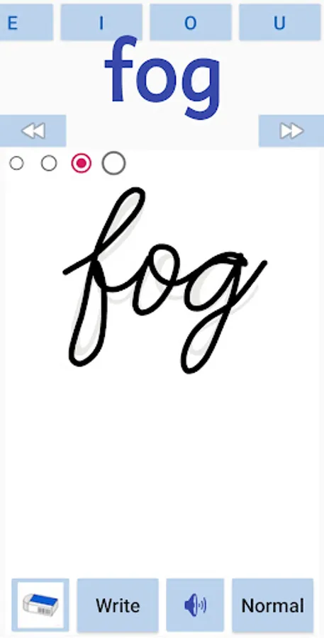 The kids can learn to write CVC words in english. The app covers all the A,E,I,O,U - Short vowels cvc works . The kids can also trace the letter in cursive or normal font. The user can also write in free flow mode. The sounds of the words will be played when the user moves from one word to another.