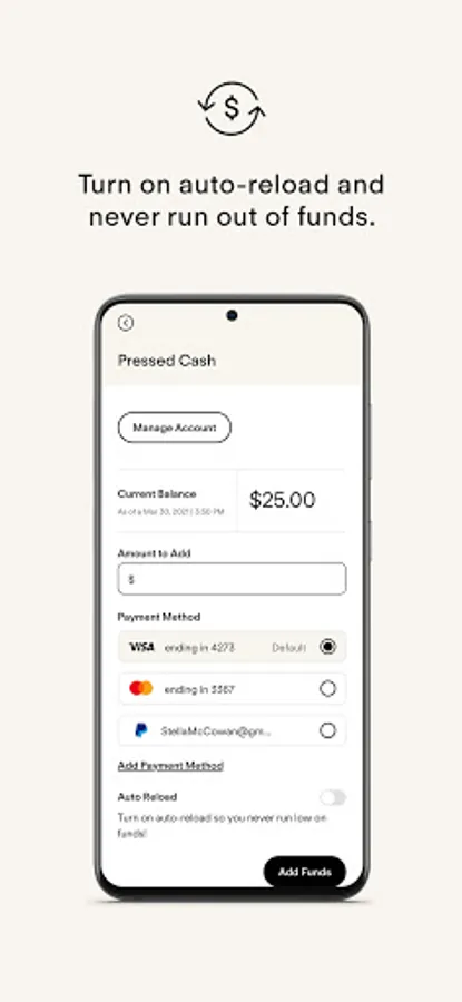 Scan to pay in-store with NEW Pressed Cash! Turn on auto-reload and we’ll add to your balance when it drops below a certain amount.