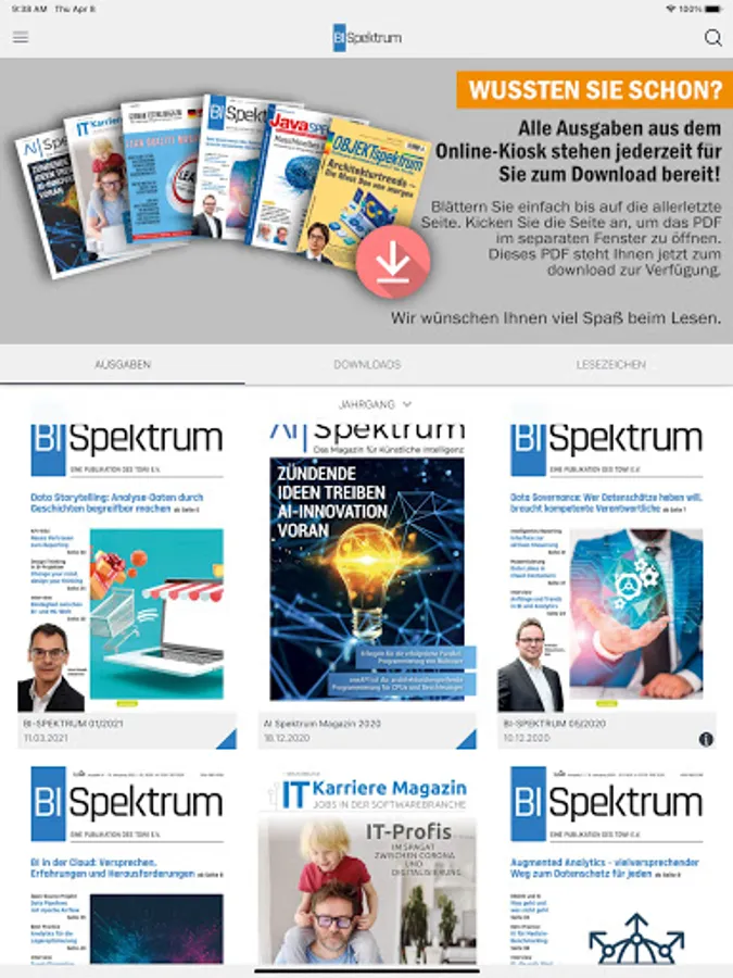BI-SPEKTRUM appears 5 times a year. Each issue is dedicated to a current title topic. In addition, selected specialist articles from the world of business intelligence and data warehousing are presented to you in each issue.