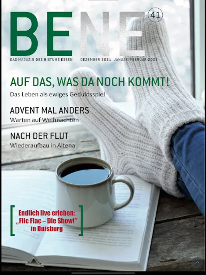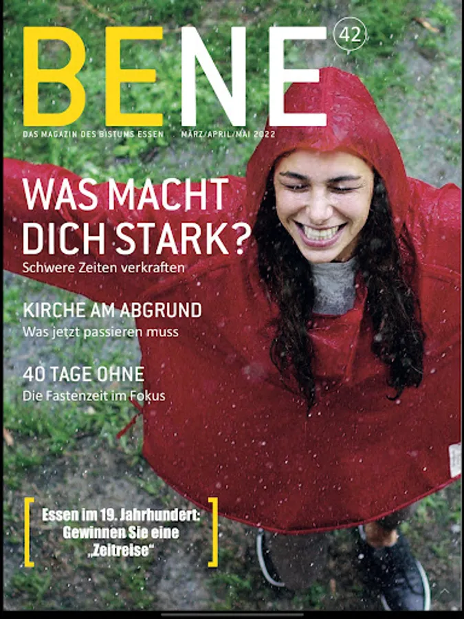 We are different. We are well. We are BENE. BENE is the diocese of Essen's magazine that conveys a new, modern and friendly image of the church. BENE is not a church newspaper like it used to be, but a magazine that approaches the diverse topics of life and faith in an entertaining and entertaining way. A magazine for all members of the Catholic Church and for those who feel connected to the values of human togetherness. Who believe in the good without having to be taught. BENE just.