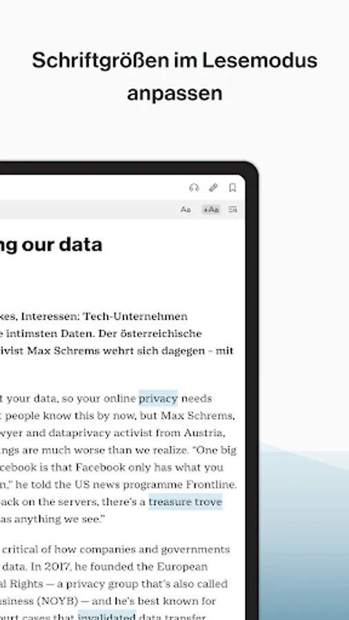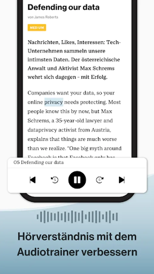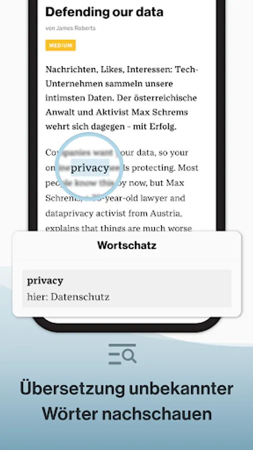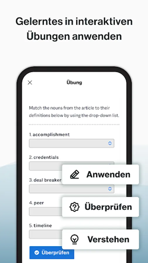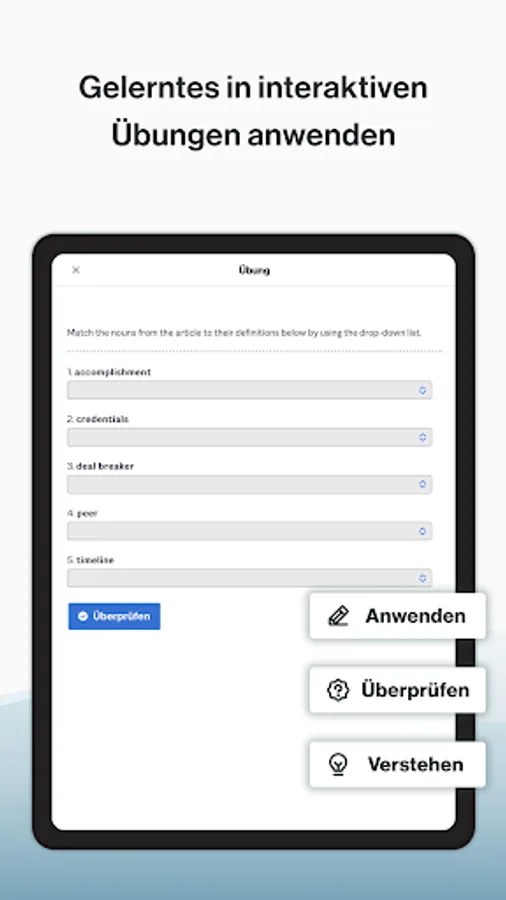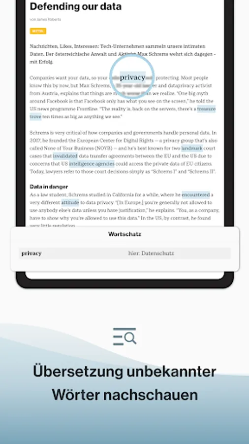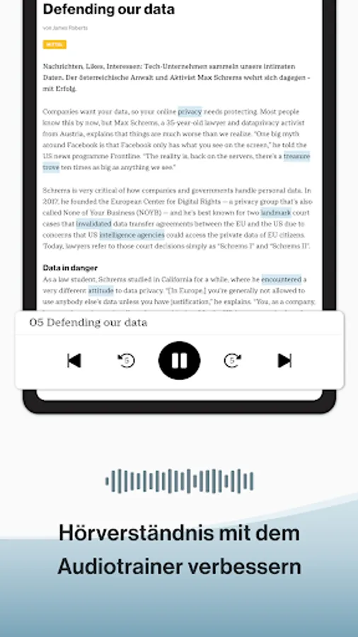 The Business Spotlight app supports you in learning business English and offers you intuitive user guidance combining text, audio content and exercises. By adjusting the font size, good readability is ensured even on small screens. Looking up unknown words directly in the text enables you to have good reading comprehension despite unfamiliar vocabulary.