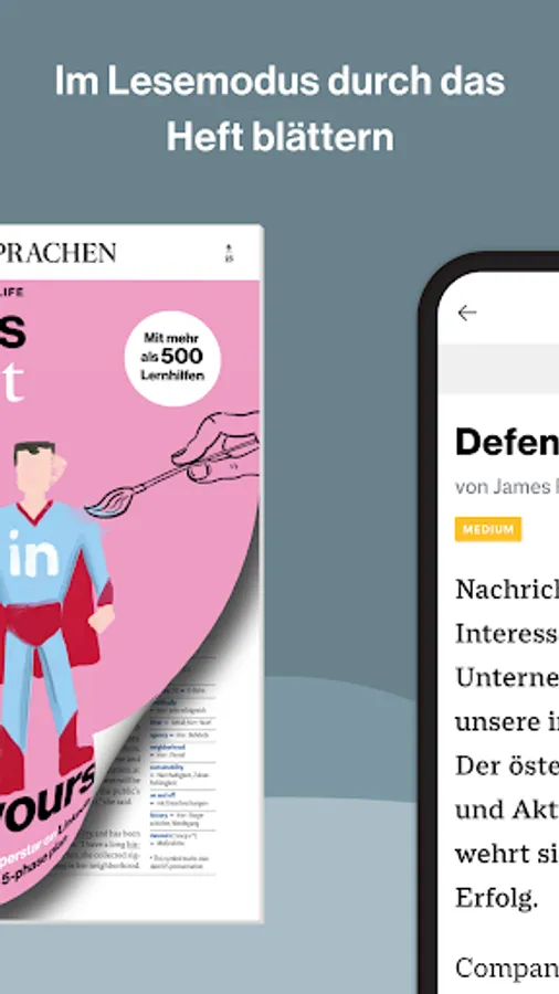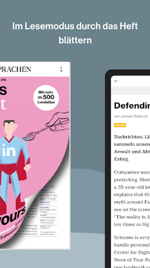 The eMagazine offers journalistic articles on current economic topics and technological developments. Each eMagazine contains 70 pages of insights into the English-speaking business world and suitable exercises at three levels: easy (A2) - medium (B1-B2) - difficult (C1-C2). The content is didactically tailored specifically to German-speaking learners. With a simple click you can hear appropriate audio content directly to the text.