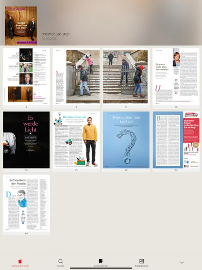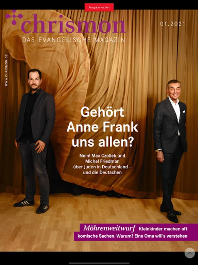 The evangelical view of people and world events is shown in a journalistic narrative way - in real stories from life. Chrismon helps people to master life with its challenges, with joy and suffering, with illness and crisis, with love and separation, confidently and responsibly. Conflicts and human stages in life are presented honestly and authentically. The unifying and comforting power of faith and the church in dealing with events and fates is made visible. chrismon answers beginner questions about the Christian religion and reports on the lively diversity of Protestant faith in Germany.