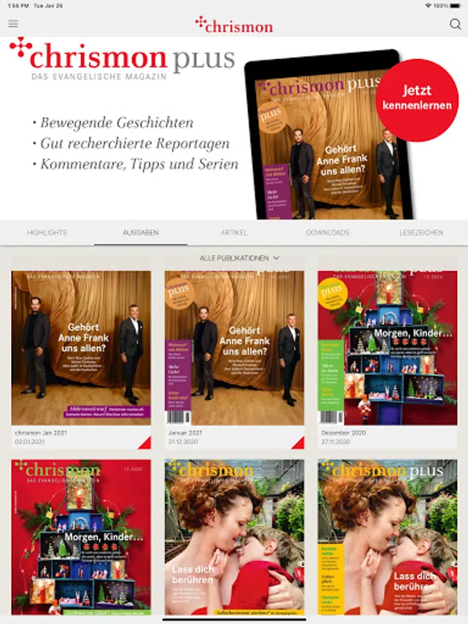 The chrismon app offers optimal reading comfort even in offline mode thanks to the download option. You can read chrismon digital in e-paper format with bookmark and download options. chrismon plus digital also offers the following functions: