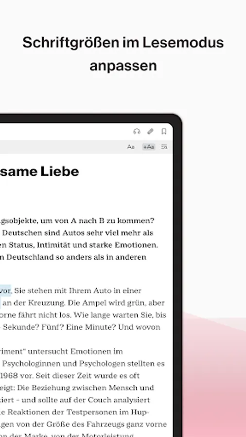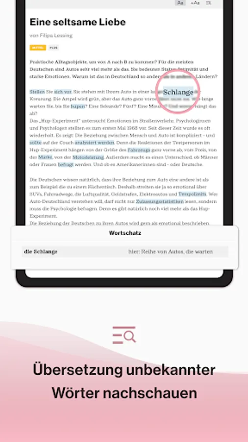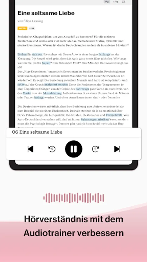 The Deutsch-perfect app supports you in learning German and offers you intuitive user guidance combining text, audio content and exercises. By adjusting the font size, good readability is ensured even on small screens. Looking up unknown words directly in the text enables good reading comprehension despite unfamiliar vocabulary.