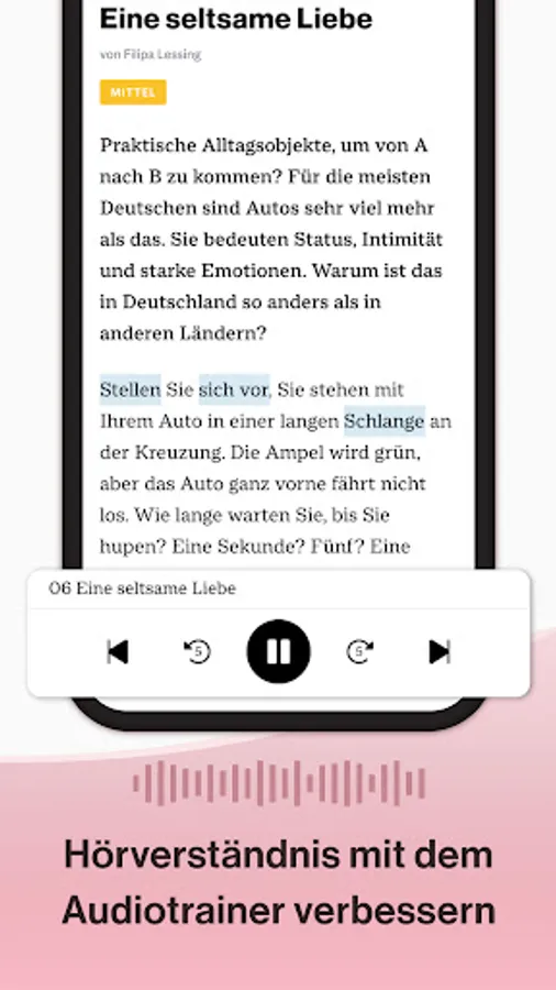 Discover 60 minutes of listening training per month. Learn, practice and listen to the German language while you're doing something else: in the car, on the go, cooking or playing sports. Listen to professional speakers and improve your vocabulary. At the same time you train your pronunciation.