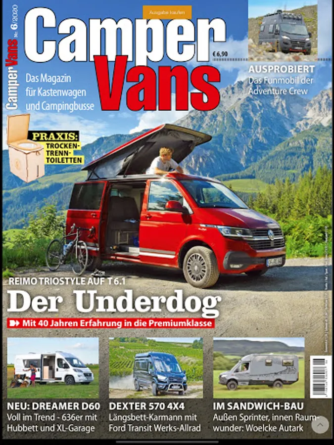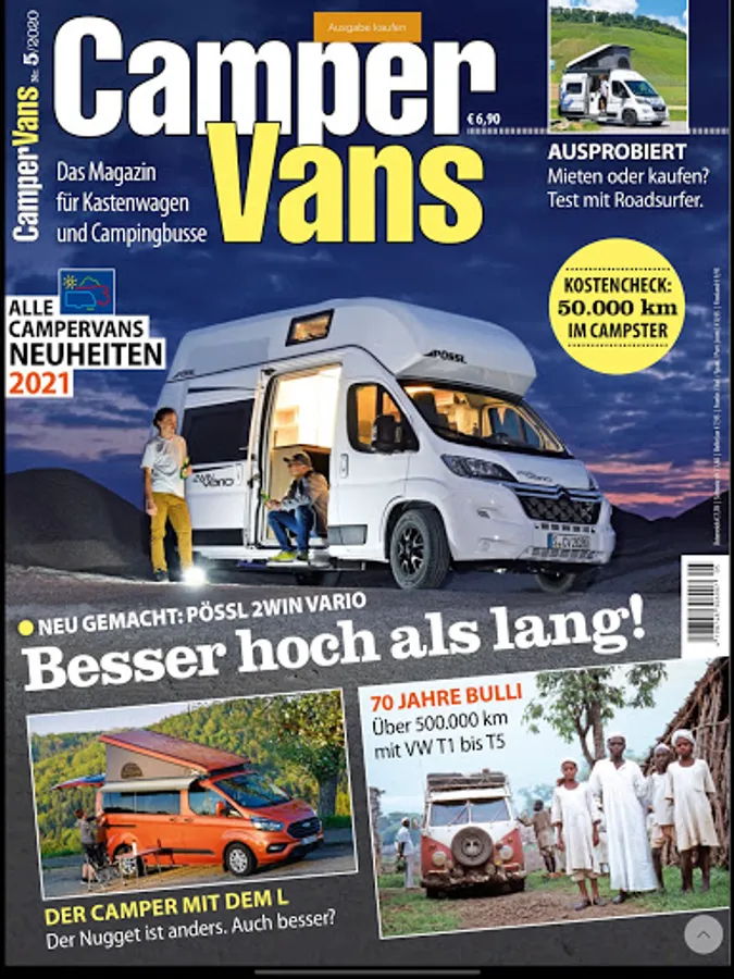 The modern magazine for vans and camper vans combines emotion and technology. CamperVans is testing for you. We therefore always critically examine current topics and trends. We are campers ourselves, live your hobby and draw on over 30 years of testing experience in all areas. Practical tests take up a large part of the book. Whether everyday, hobby or vacation: Here we test the vehicle as it would be used by you. There are also compact tests, reports, travel, accessories and equipment tips.