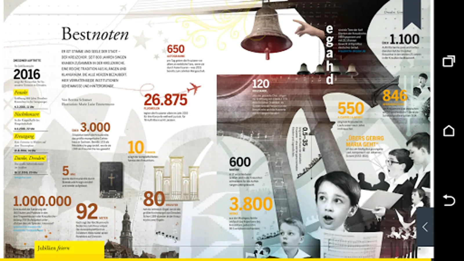 The new 2016 edition of "Dresden Magazine" carries the title "Dresden. Celebrating Together". Regionally manufactured products, the Dresdner Kreuzchor and Kreuzkirche - Both mark Their 800th anniversary this year - the Elbe Valley and its beautiful nature, the sensual pleasure of exotic tastes and scents, scientific advances and new ideas - Dresden is celebrating and showing all its colors! Innovation, openness, diversity and understanding can be experienced here.