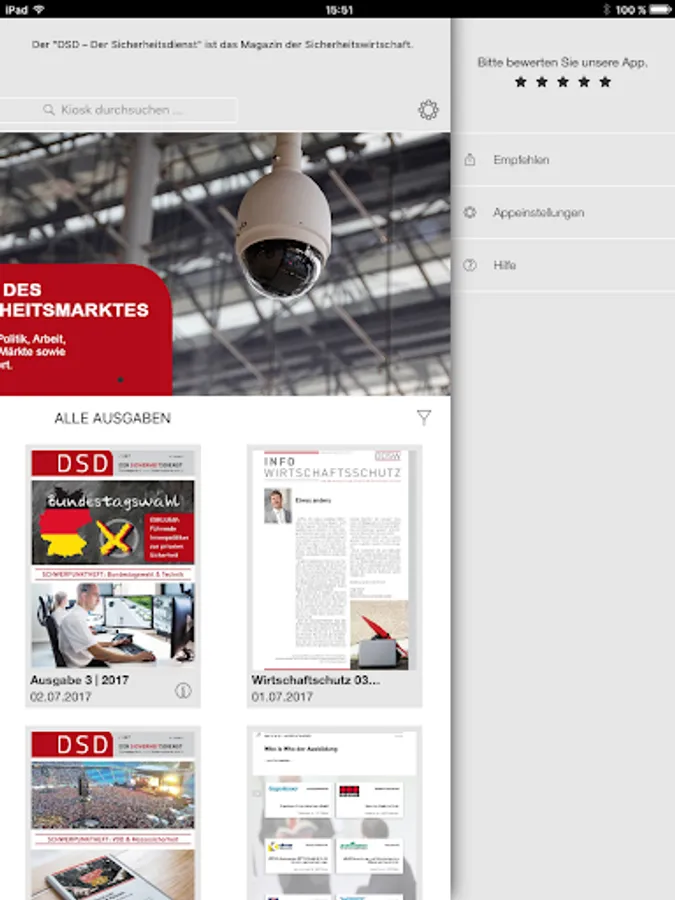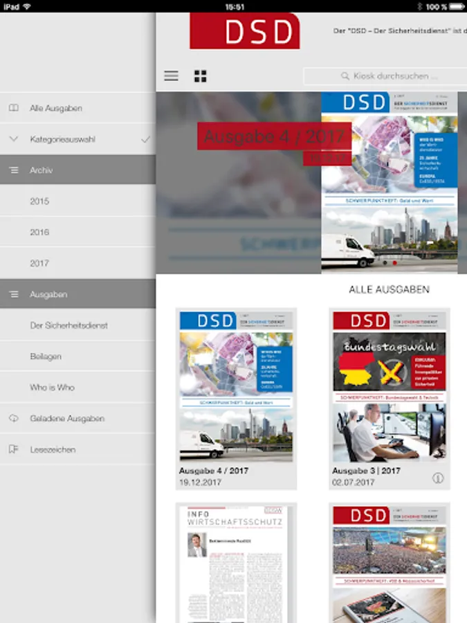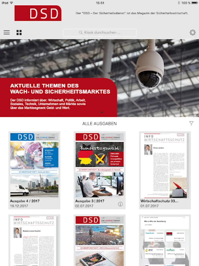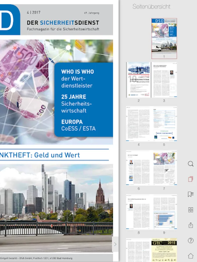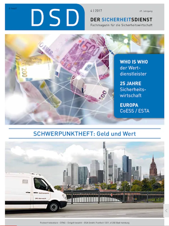 The "DSD - The Security Service" is the journal of the security industry. It appears in the print version four times a year with a circulation of 11,000 copies. The DSD informed about current issues in the security industry: business, government, labor, social, technology, business and markets, as well as cash and valuables services and aviation security. The DSD is open to all who are interested in the security industry or work in this.