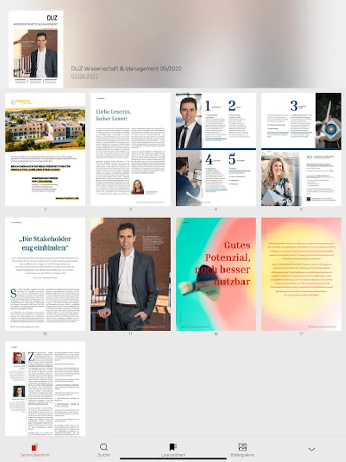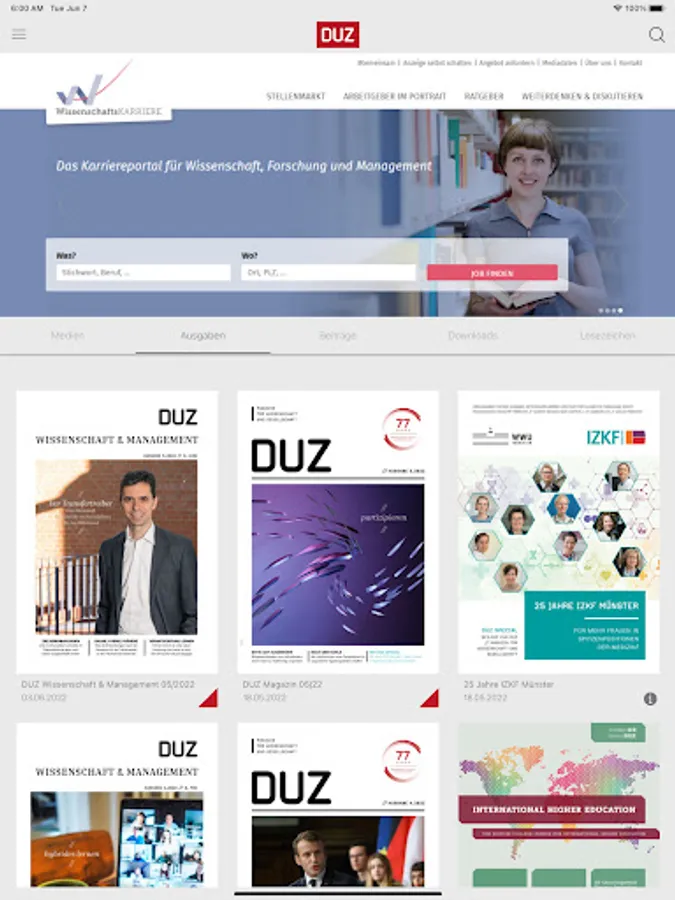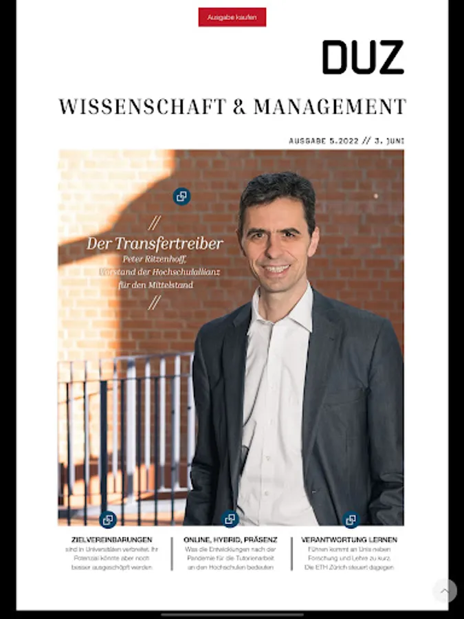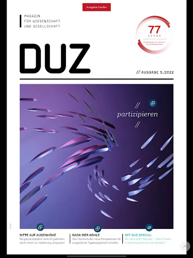 The DUZ app includes the digital edition of the DUZ magazine for science and society with 12 issues per year and DUZ Science & Management with 10 issues per year. DUZ magazine readers also receive the Boston College Center for International Higher Education quarterly four times a year. The supplement DUZ Special is published several times a year and is freely accessible to all.