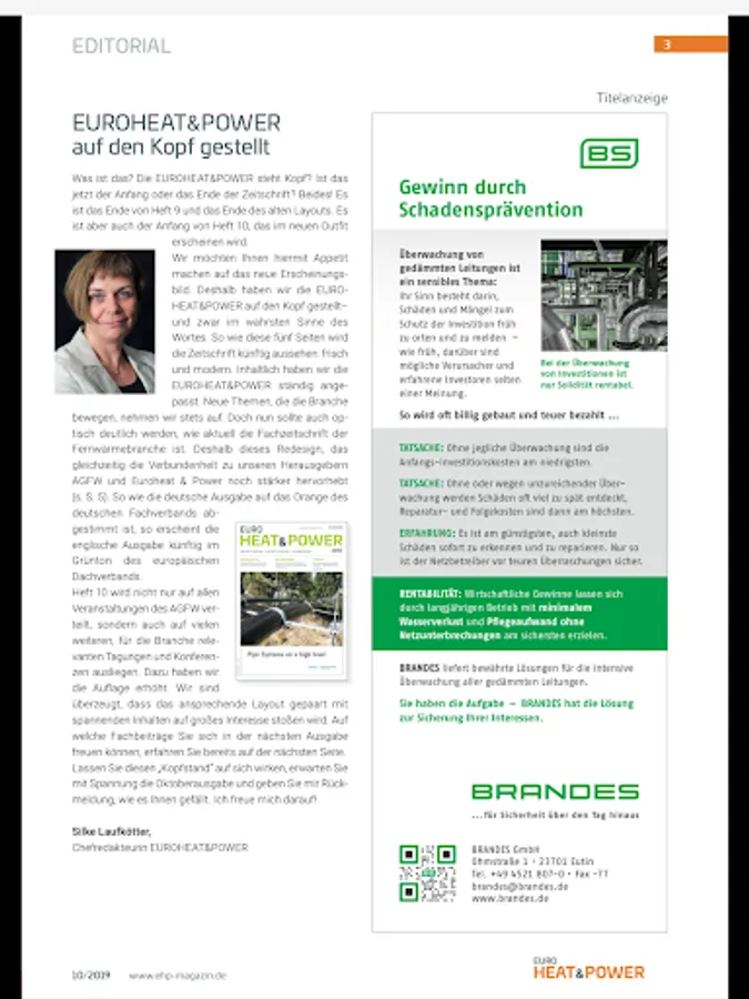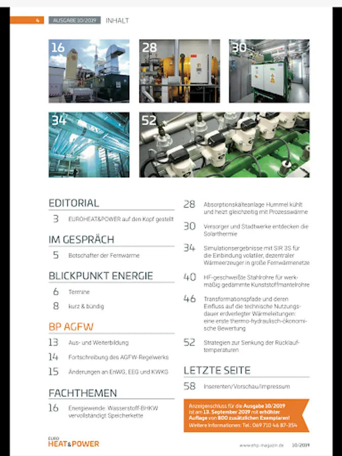 The e-magazine, the only specialist magazine specifically for the district heating industry, provides expert knowledge of the entire process chain from heat generation to billing. The specialist reporting reflects scientific and subject-specific know-how about trends in the industry, technical innovations and energy policy and energy industry developments.