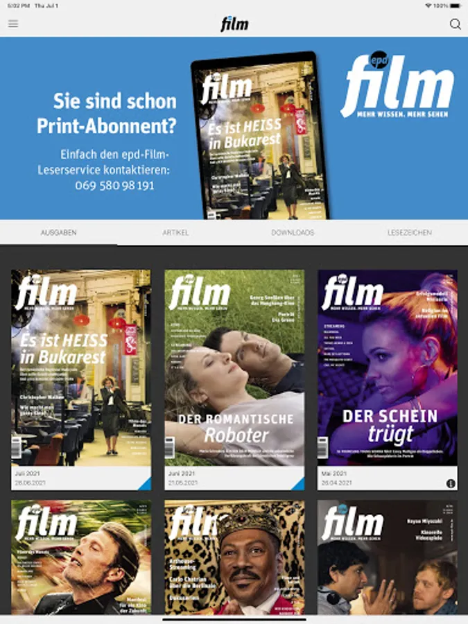 Subscribers to the print version can use the app issues free of charge by entering their eight-digit customer number (entry under "Settings"). If you have any questions or comments, please write to us at leserservice@epd-film.de.