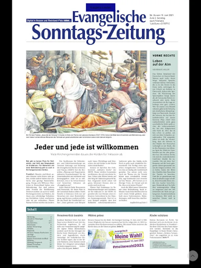 With the Evangelische Sonntags-Zeitung for Hesse and Rhineland-Palatinate, you will learn quickly and reliably what is happening in the church: in the region, in Germany and beyond. The weekly is a reading experience around Christian life in all its diversity.