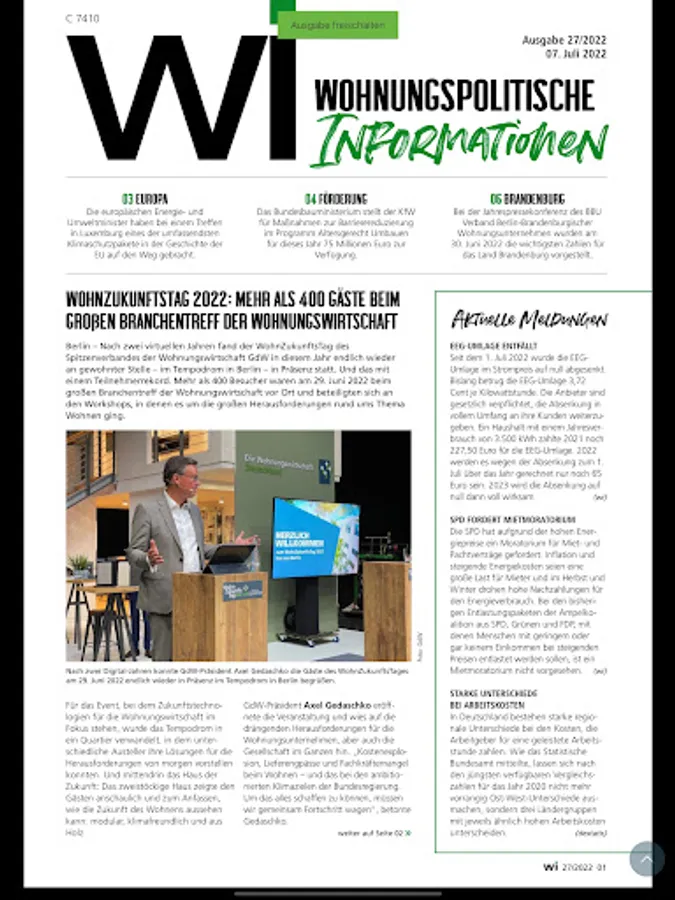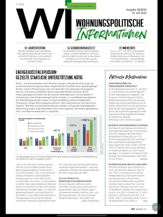 Examples of GdW publications are: GdW arguments, GdW compact, wi journal, as well as the wi housing policy information.