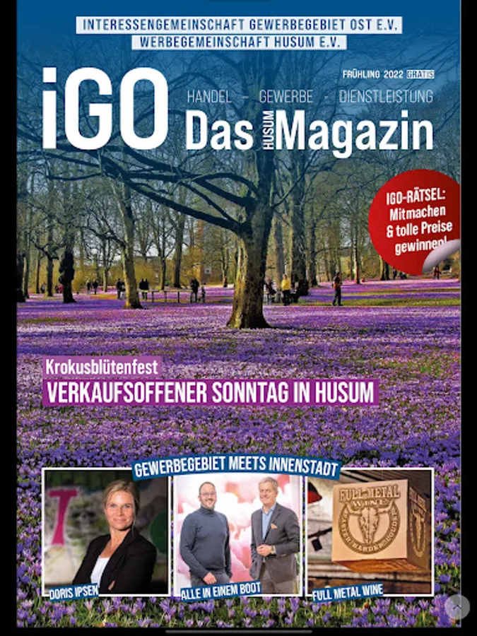 For more than 10 years we have been reporting and providing information about companies from the retail, trade, service and gastronomy sectors that are active in the Husum East industrial park and in Husum's city centre. We offer the Husum economy an exclusive platform to present itself. In addition, the iGO magazine reports on current topics that are of interest to the citizens of Husum or visitors to the city. The range of topics is supplemented by entertaining items, entertainment and competitions. The iGO magazine provides information about dates and events in the city of Husum. The whole thing is rounded off by a comprehensive company directory and an orientation map (company finder).