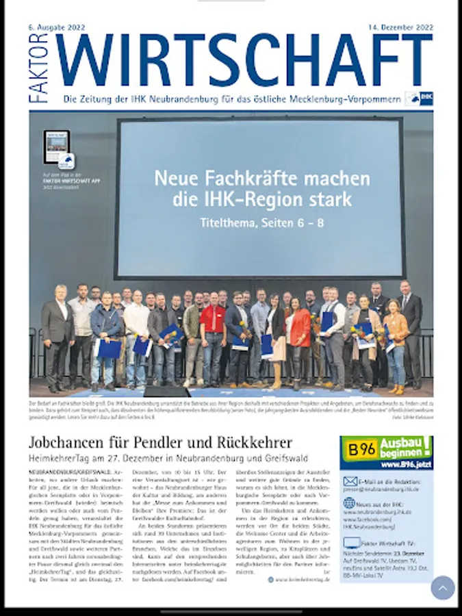 "ECONOMIC FACTOR" is a regional business newspaper, the official organ of the Chamber of Commerce Neubrandenburg for eastern Mecklenburg-Vorpommern. Since 2007, attacks "ECONOMIC FACTOR" as the first West German Chamber publication the trend of a modern newspaper. "ECONOMIC FACTOR" is intended for all companies in the eastern Mecklenburg-Vorpommern, in addition to many companies in the adjoining counties. With a monthly circulation of 20,500 copies reached "ECONOMIC FACTOR" without any leakage in this area coverage large companies, medium-sized businesses and individual entrepreneurs and self-employed.