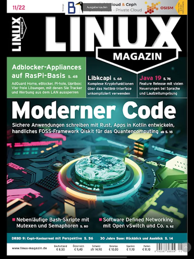 The flagship among the Linux publications appears monthly and informs since 1994 independently and qualified. The topics range from software, network, administration, development, training to hardware. The use of Linux in enterprises and the associated migration are important components.