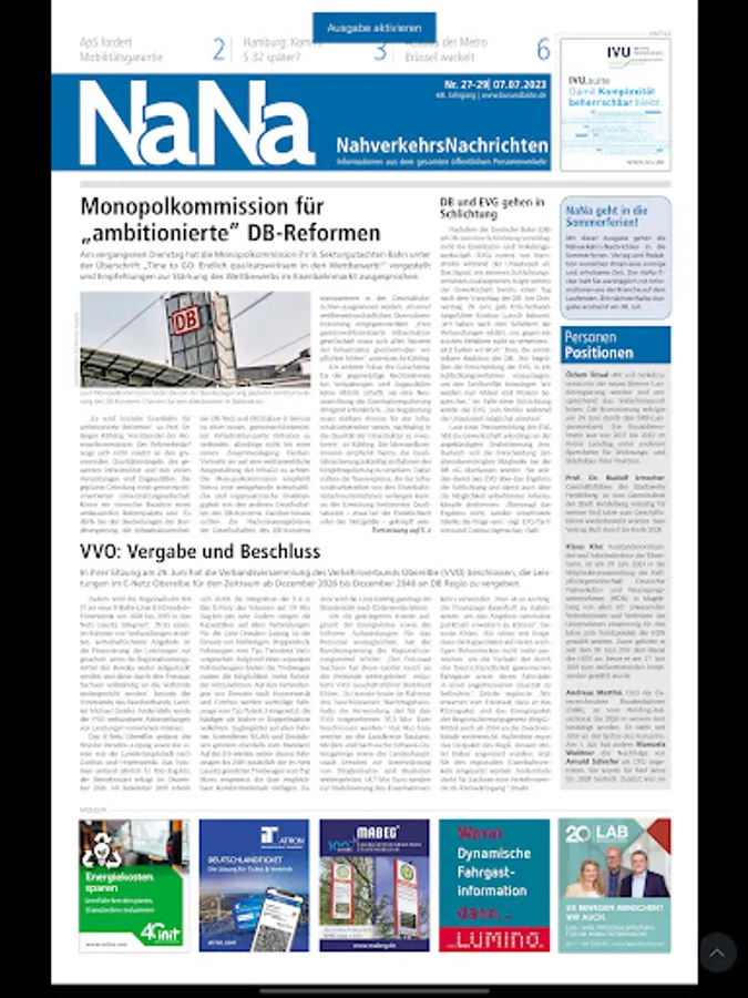 The kiosk Alba Fachmedien public transport is your digital access to the leading specialist publications for public transport. The app allows you to quickly and comfortable reading the ePaper the weekly "transport messages (NaNa)", the information service "NaNa-letter" (formerly "public transport currently") and the trade journal "The transport".