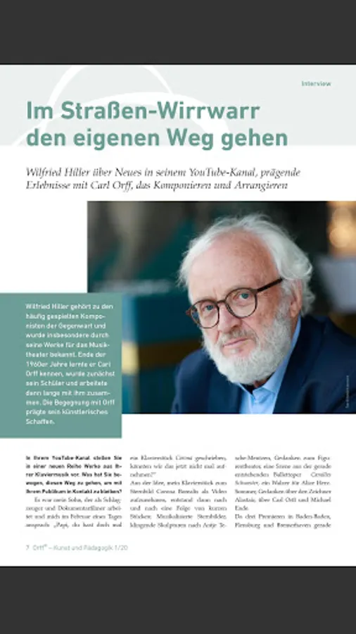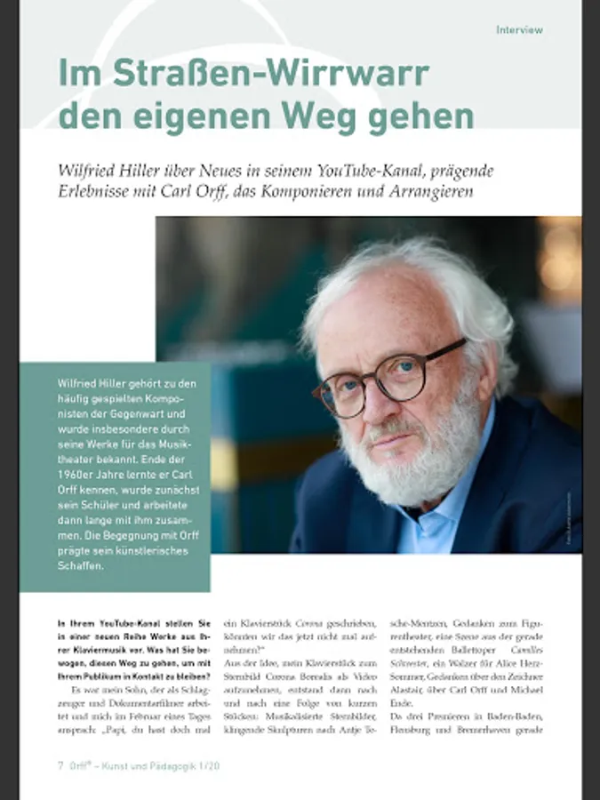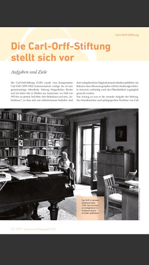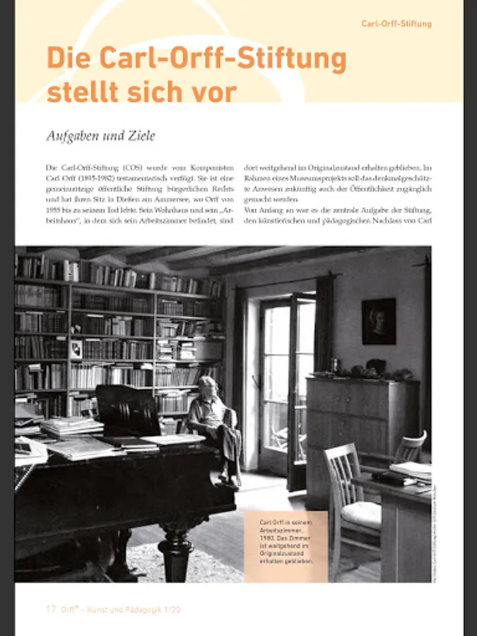 Carl Orff's work is timelessly topical and continues to influence artists and educators around the world to this day. Dealing with his work is the focus of the magazine "Orff ® - Art and Education", which deals equally with the compositional and educational work of Carl Orff.