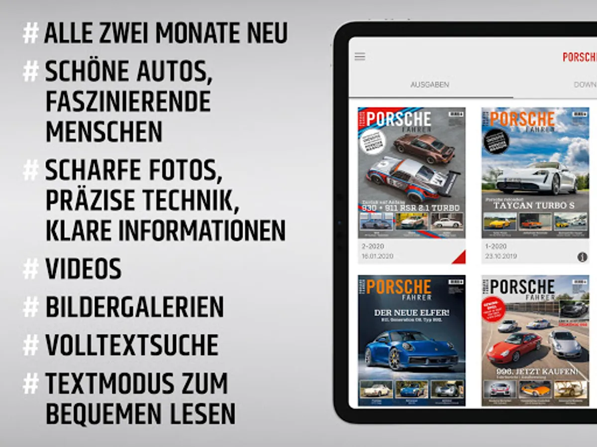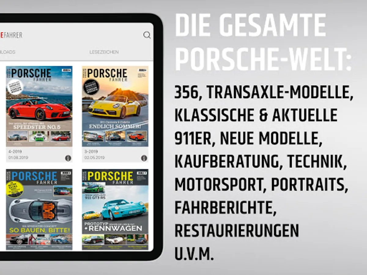 With the digital subscription you get Porschefahrer one year at a preferential price of € 21.99. The subscription is automatically renewed at the end, but may be terminated 24 hours prior to expiration.