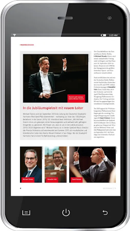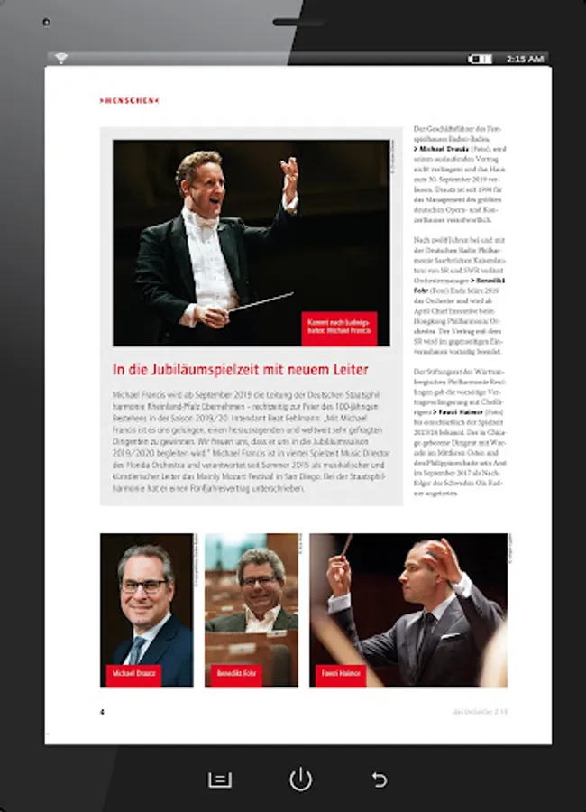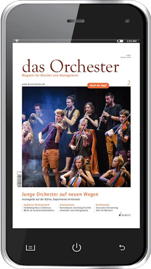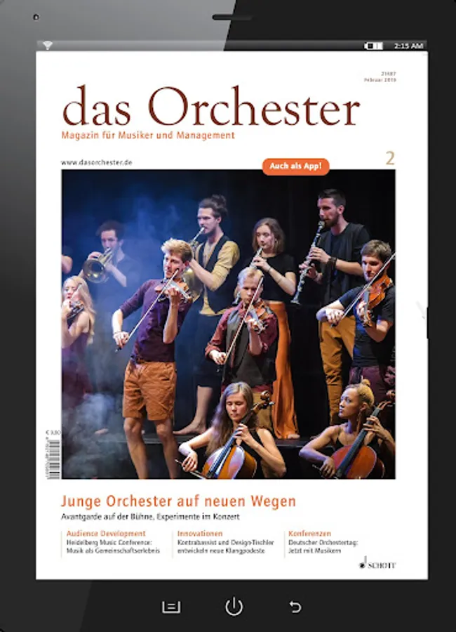 The Orchestra Magazine for Musicians and Management is the leading professional journal for orchestra professionals and also the magazine with the largest job market for orchestra musicians worldwide. The magazine provides specialist contributions on the topics of musician education and professional life, music medicine, music education, audience acquisition and cultural financing, orchestral marketing and management. Each issue takes a look at the international orchestra landscape, at the work of the radio choirs and studies on audience research. Reports on concert series, music theater premieres, music festivals, competitions, symposia and numerous new-look reviews reflect the current musical life