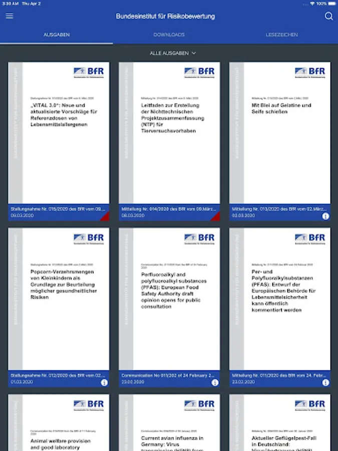 App provides information on all health assessments and statements from the Federal Institute for Risk Assessment (BfR). In addition to current publications, statements up to and including 2002 can be viewed.
